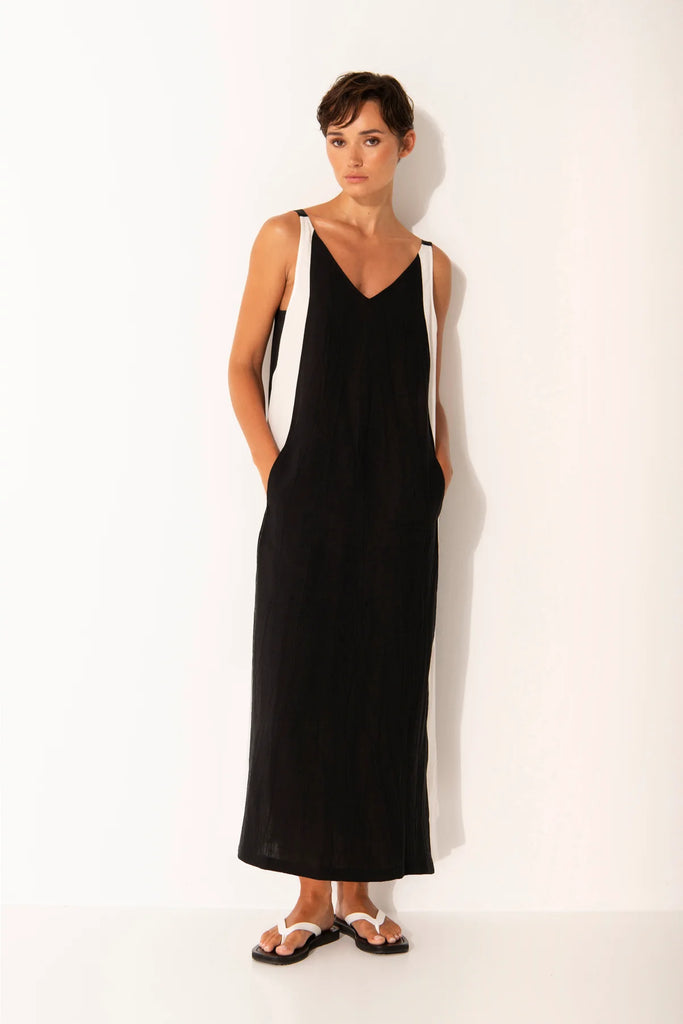 Linen Blend V-Neck Maxi Dress Malta - Black/White