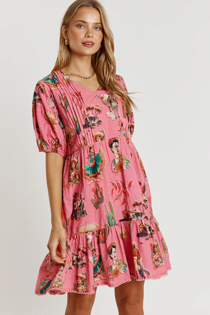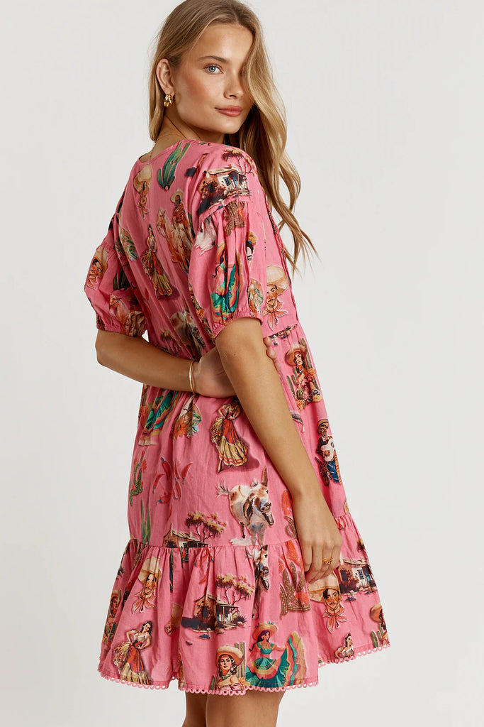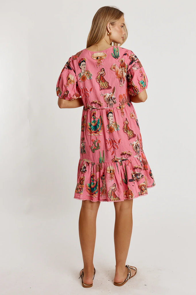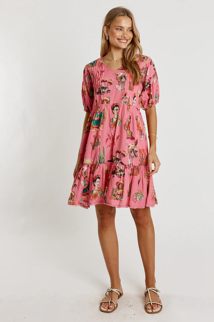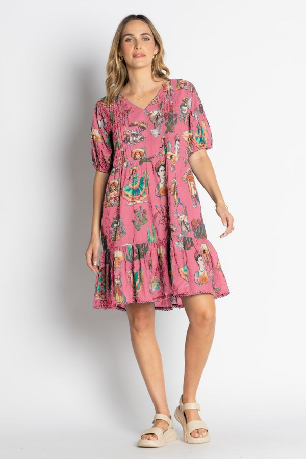 Brighten your wardrobe with the LulaLife Arriba Dress, a playful blend of comfort and style. Crafted in Australia from lightweight 100% cotton voile, this knee-length dress is perfect for warm-weather dressing. Featuring a relaxed fit with a flattering V-neckline, vertical tucks on the bodice, and tiered gathered panels, it offers a breezy and feminine silhouette. The gathered elbow-length sleeves with soft elastic hems add comfort, while practical side pockets make it easy to wear every day. Finished with a retro Mexican western-inspired digital print, this dress is a vibrant choice for summer outings, holidays, or casual weekends.