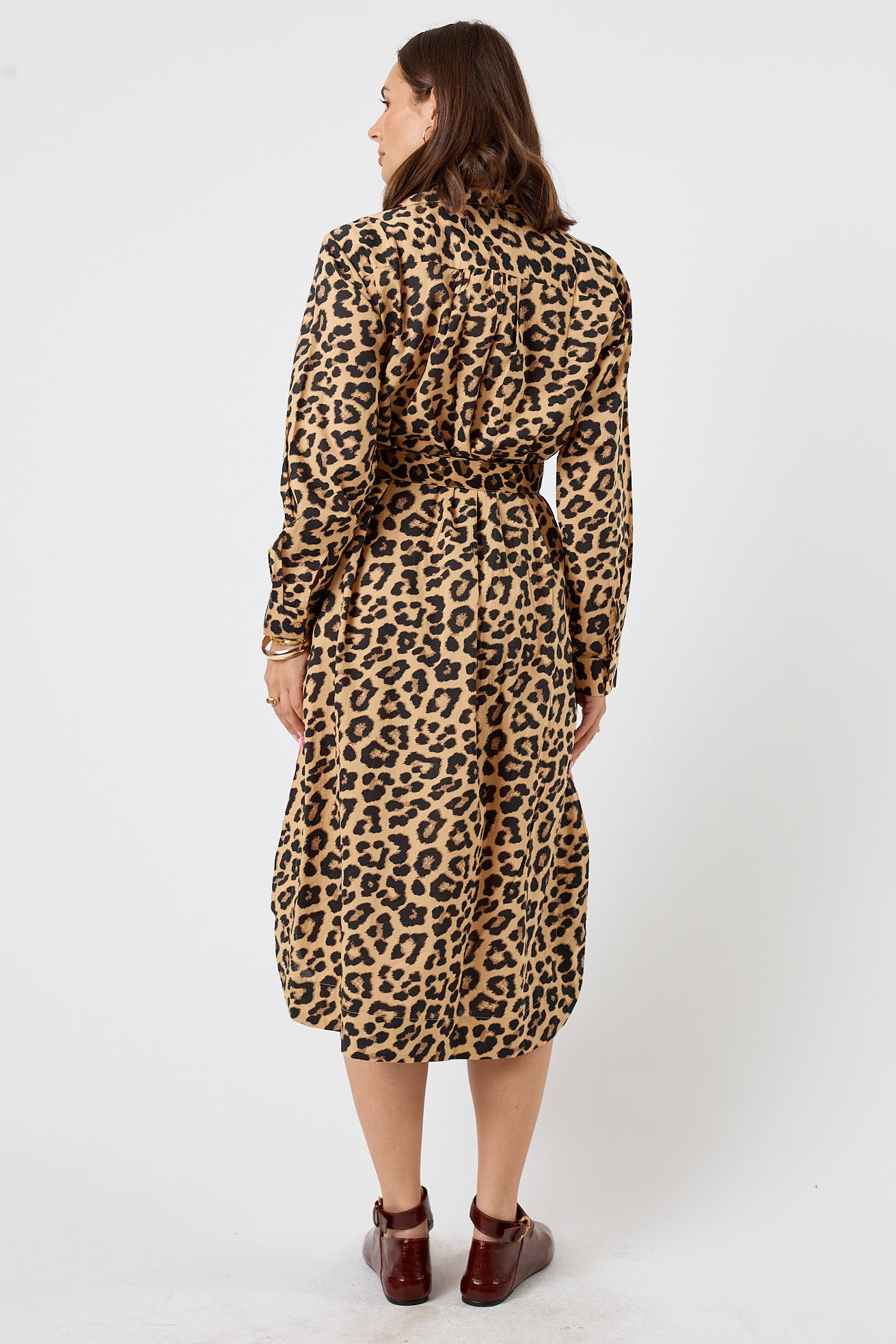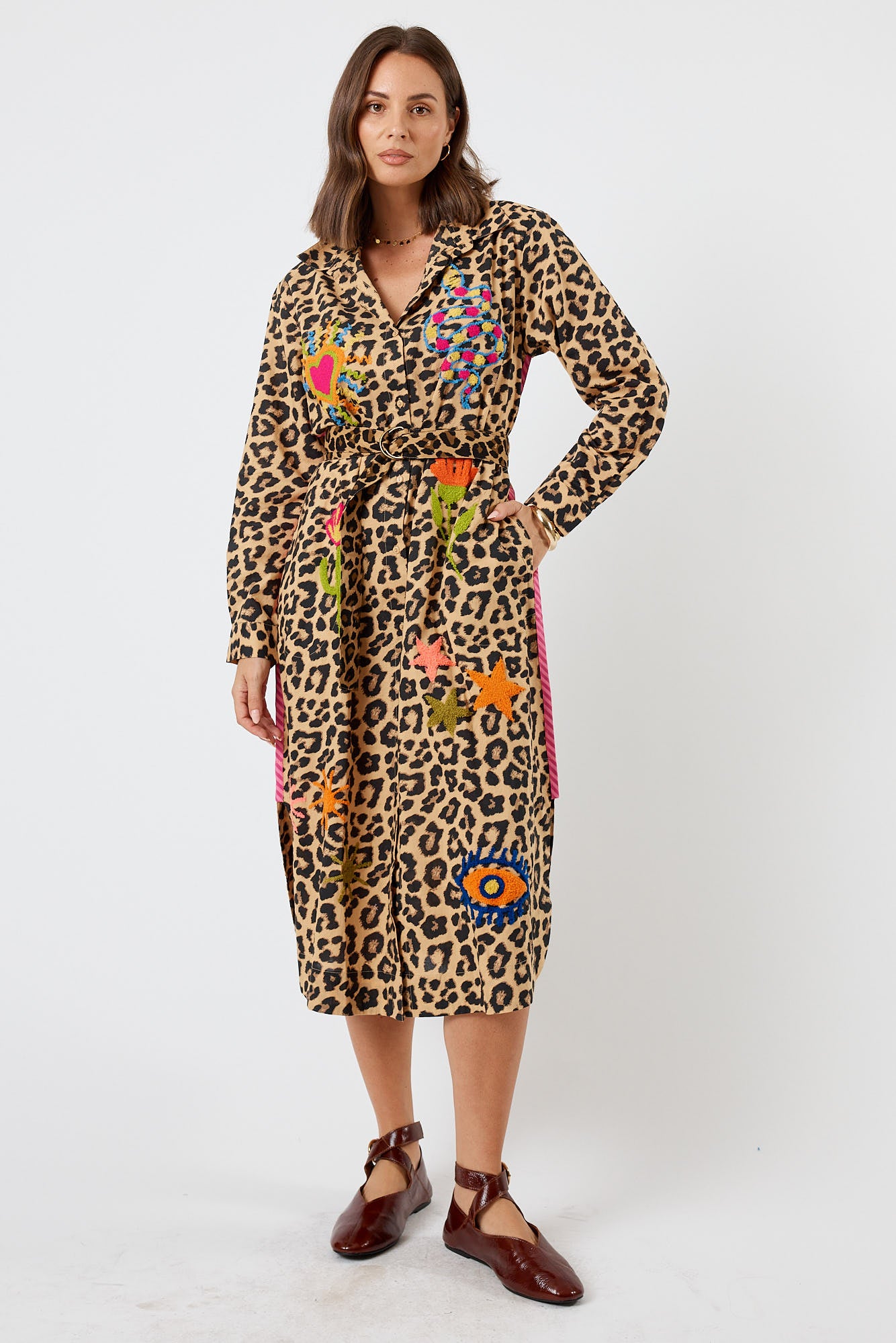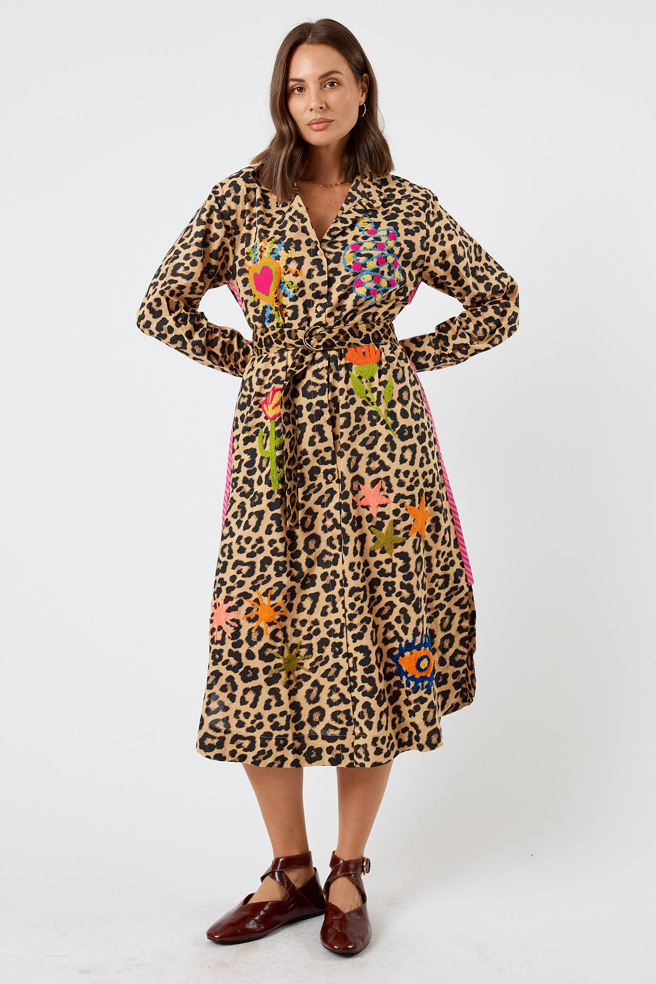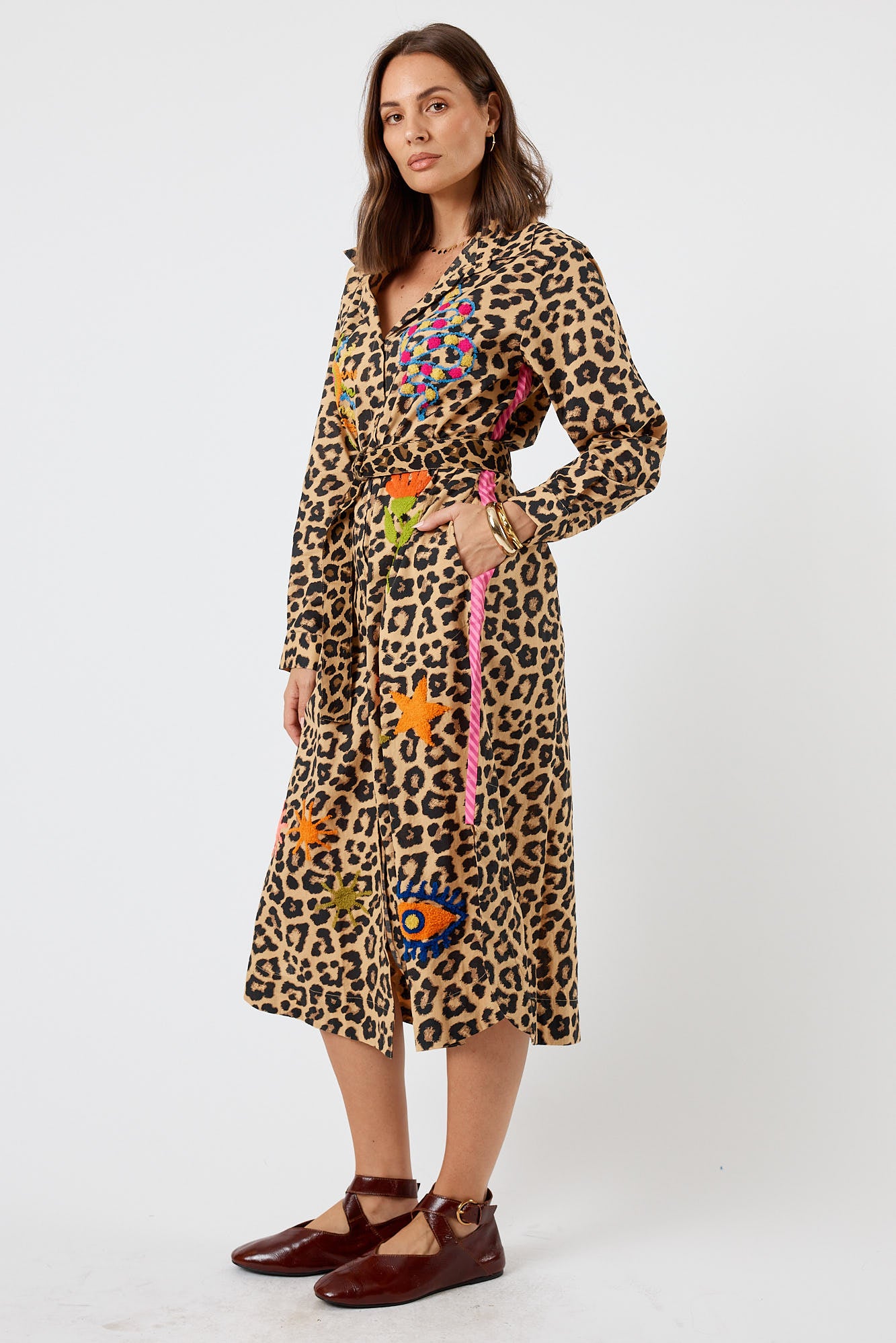 Leopard print meets crisp cotton in the LulaLife Azure Shirtmaker that somehow works with everything else in your wardrobe. This 100% cotton shirtmaker feels cool and breathable on sunny mornings that stretch into big days, with thoughtful details like grosgrain stripe trim and textured embroidered motifs. The adjustable buttoned cuffs and curved hem give it that perfectly undone look, while the D-ring belt lets you switch up the shape. Side pockets and a structured shoulder yoke make it as practical as it is eye-catching.