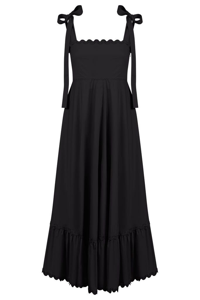 A true showstopper. This 100% cotton maxi dress features a square neckline and tie-up shoulder straps that can be styled at the top or back, offering versatility with a feminine touch. Bold ric-rac trim detailing at the neckline, waist, and hem adds playful texture.