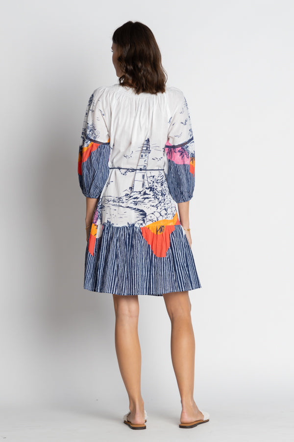 The LulaSoul Byron Dress is a breezy and feminine piece designed for effortless summer style. Made from lightweight fabric, it features a relaxed fit with a round neckline highlighted by shirring and gathers for soft detail. The ¾ raglan sleeves are finished with ladder lace and elastic hems, while the gathered flounce hem adds movement and charm. With side pockets and an optional waist rope tie for versatile styling, this above-knee digital print dress is perfect for everyday wear, weekend outings, or holiday escapes.