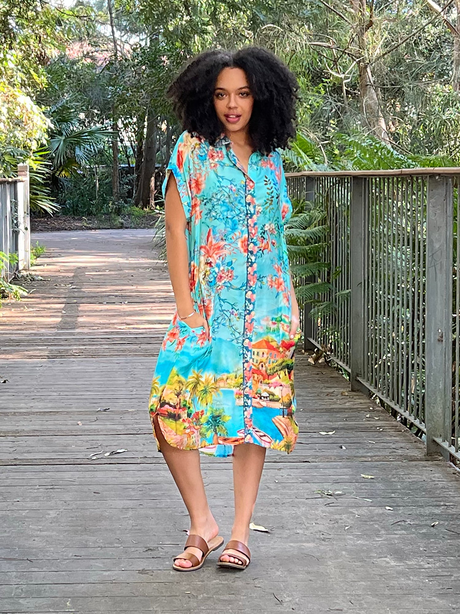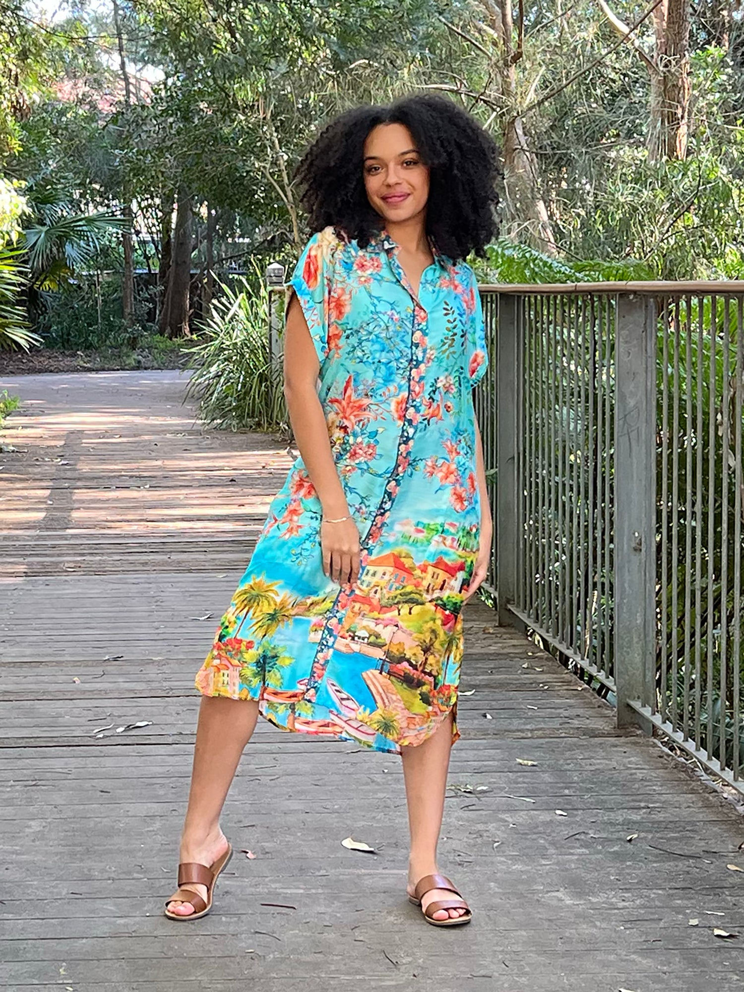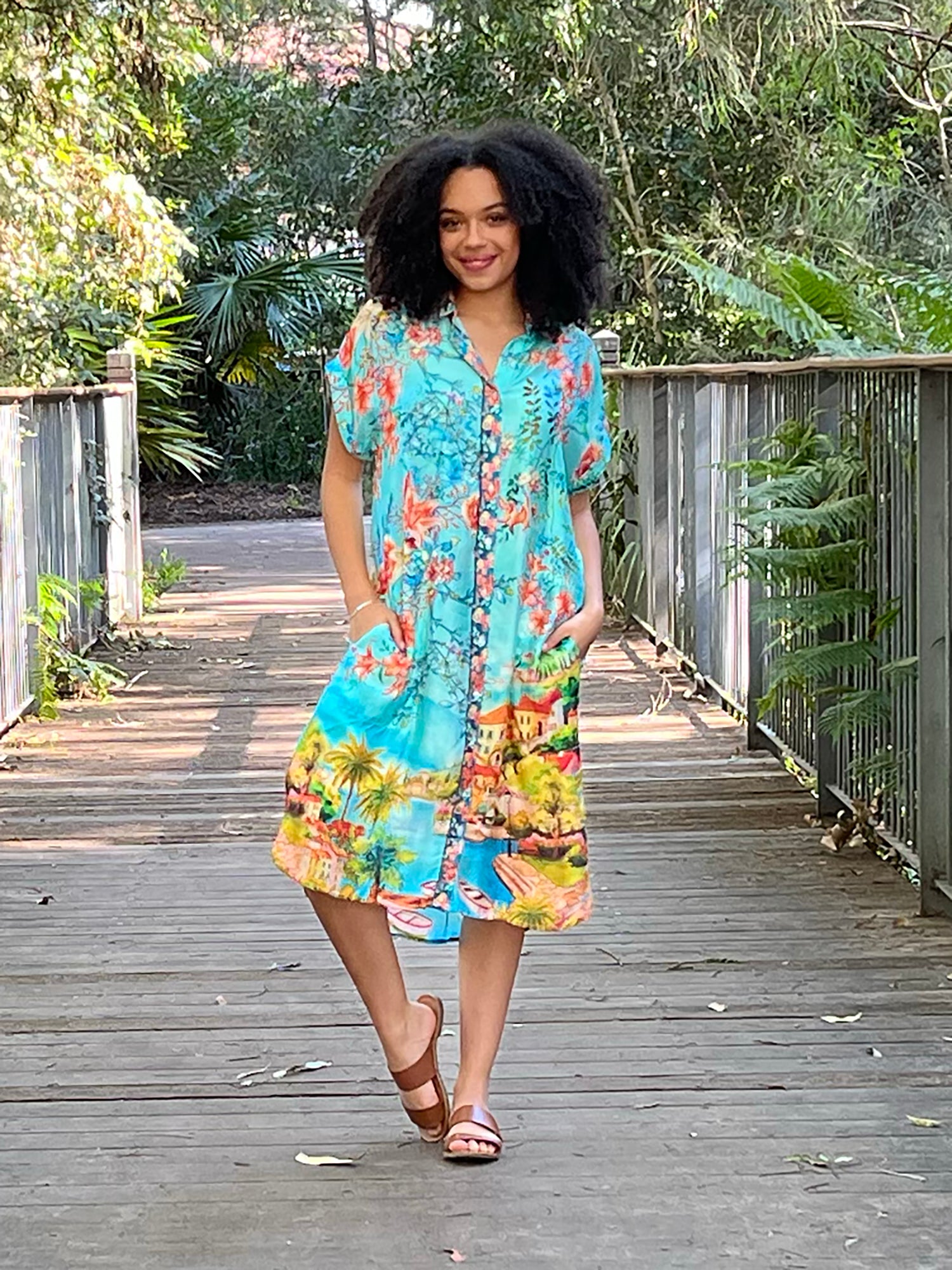 A vibrant escape in dress form. The Como Dresden Dress by Cienna features a breezy silhouette with scenic coastal motifs and floral accents in rich turquoise tones. Crafted from a soft silk/viscose blend, it’s designed for relaxed elegance with short sleeves, a button-down front and handy pockets. Ideal for holiday days or sun-drenched strolls.