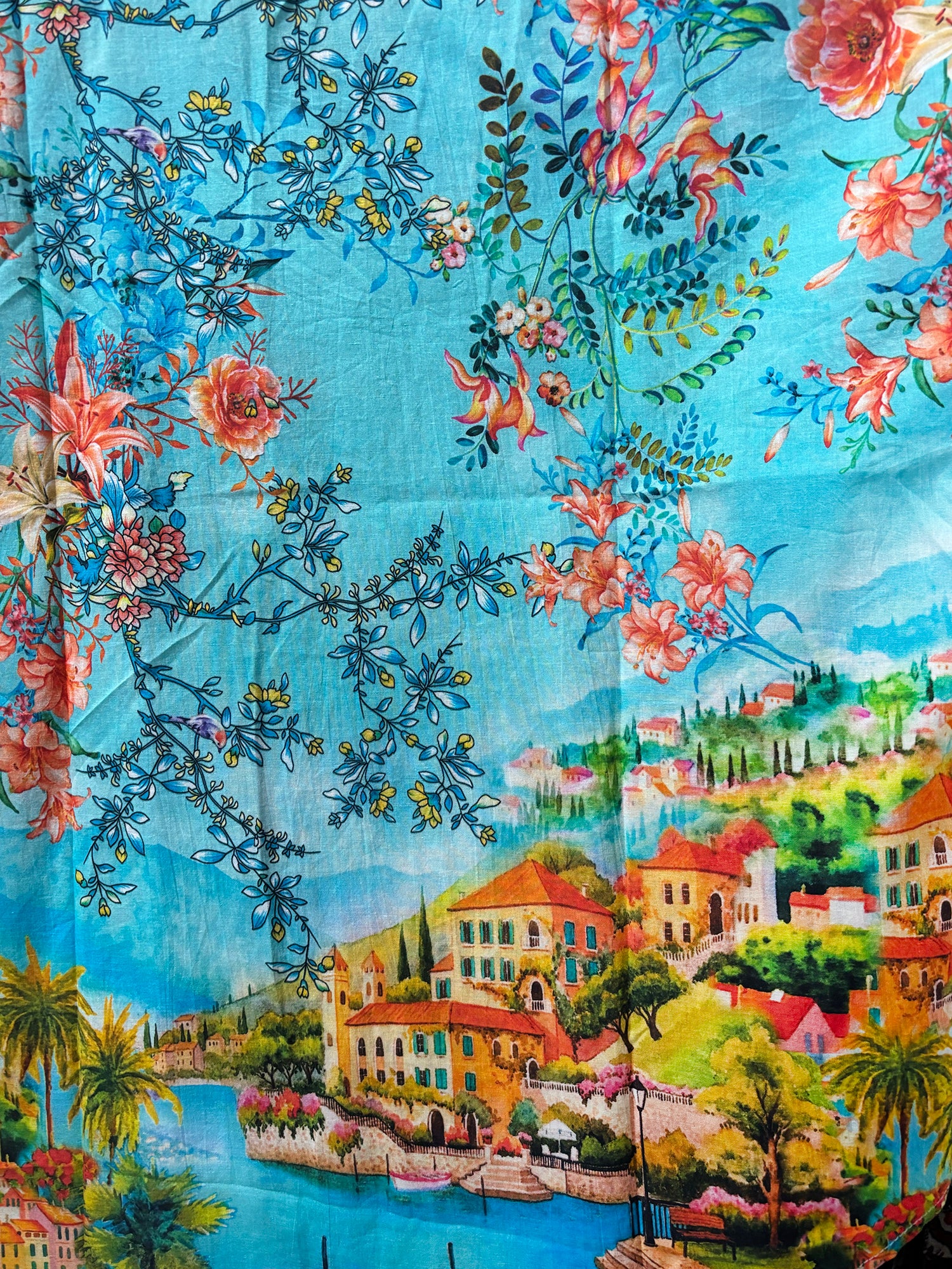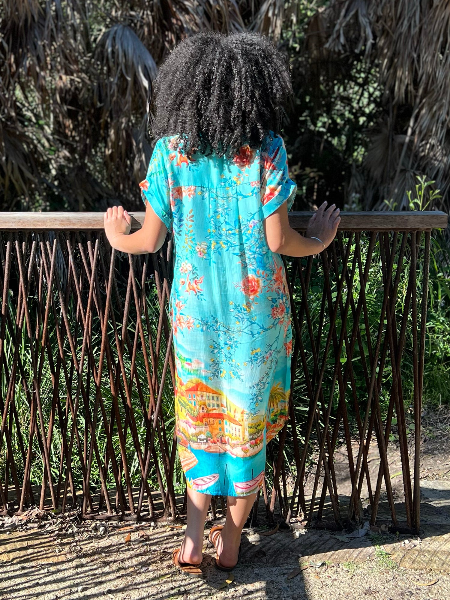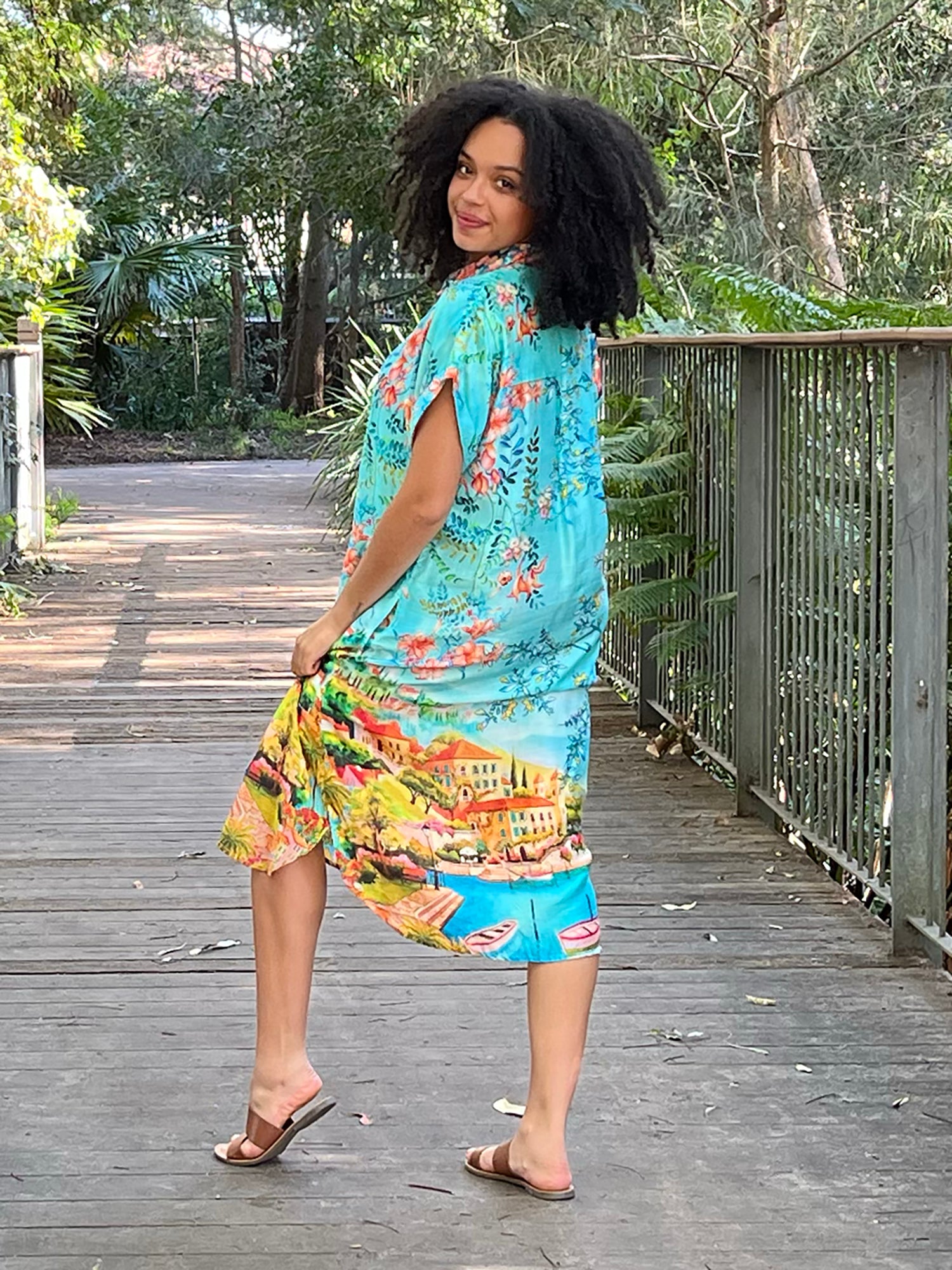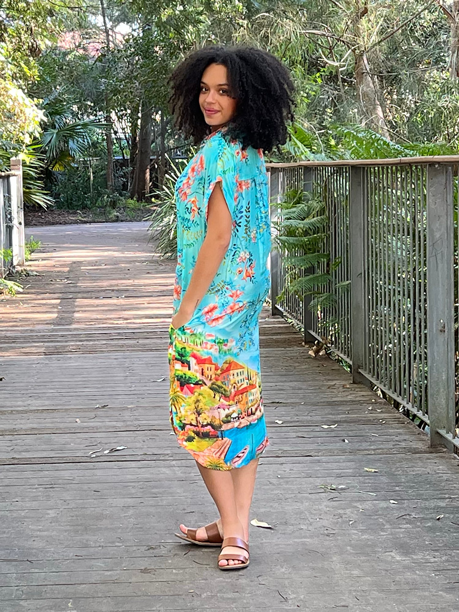A vibrant escape in dress form. The Como Dresden Dress by Cienna features a breezy silhouette with scenic coastal motifs and floral accents in rich turquoise tones. Crafted from a soft silk/viscose blend, it’s designed for relaxed elegance with short sleeves, a button-down front and handy pockets. Ideal for holiday days or sun-drenched strolls.