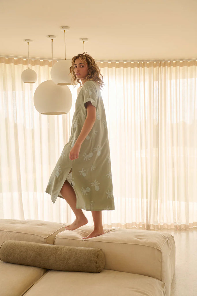 The Emily Dress is a classic popover dress featuring clean lines and some subtle pineapple embroidery detail. This easy-to-wear cotton-linen blend piece is cut in gentle A-line maxi silhouette and designed with a gentle V-neck and not-too-high side splits for movement.