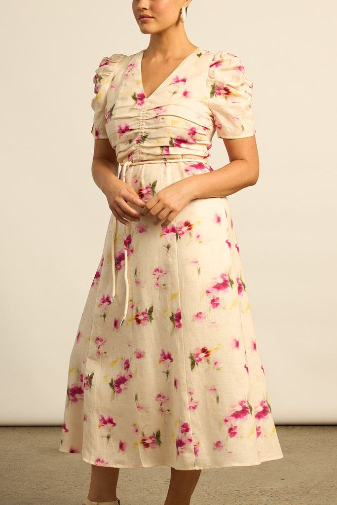 crafted in linen, the glimmer dress features a flattering v neckline with front gathers leading into a softly gathered blouson sleeve. An A line skirt creates soft movement and balances perfectly with the more fitted and defined bodice.