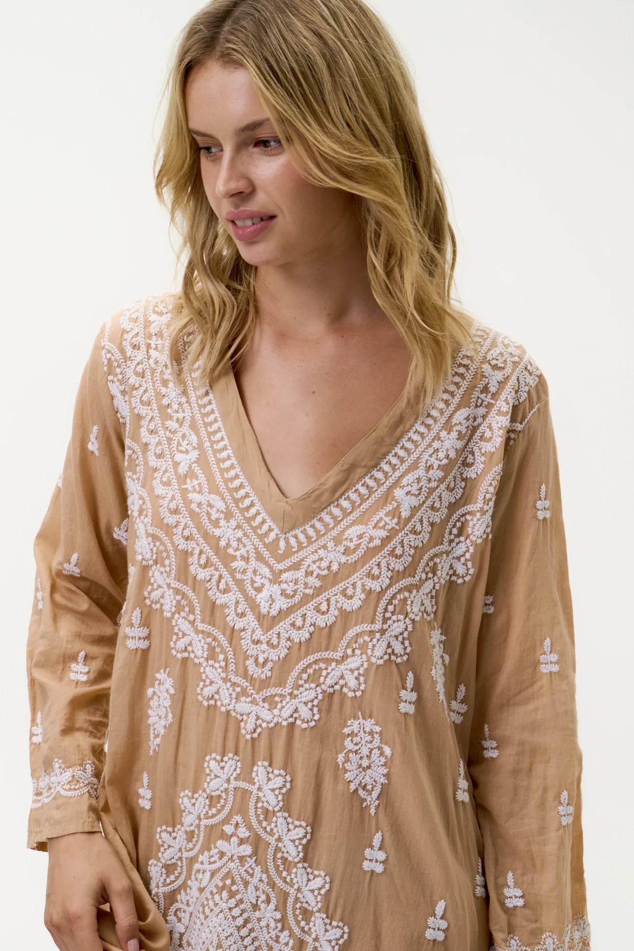 The Goa has a hand embroidered look and is a oneseason must-have for the beach. This contemporary take on the classic kaftan features a deep V-neckline and side splits for long walks or lounging. All-over embroidery adorns the longer style cover-up.