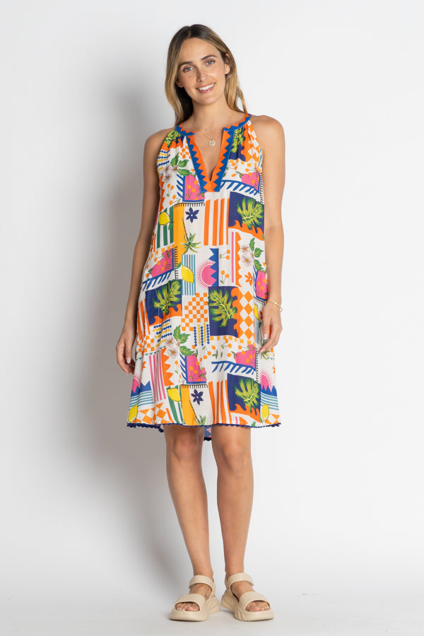 Bright, bold, and effortlessly stylish — the LulaLife Lyra Sundress is perfect for warm, carefree days. Featuring a vibrant patchwork-inspired print, this sleeveless A-line dress flatters with its relaxed fit and V-neckline trimmed with playful detailing. Crafted from lightweight viscose, it drapes beautifully and keeps you cool and comfortable. Pair it with sandals for an easy summer look that goes from beach to brunch with ease.