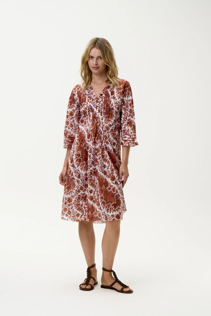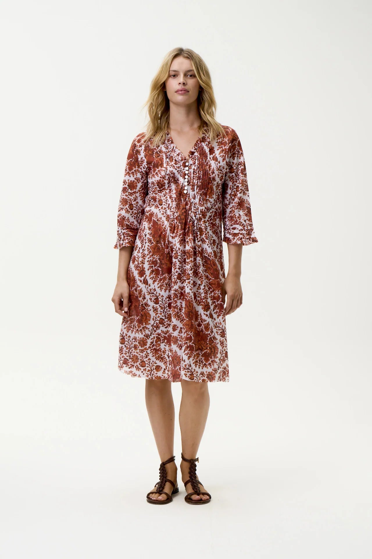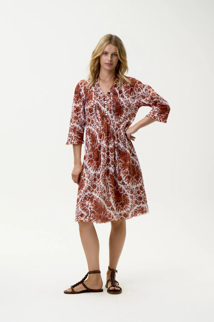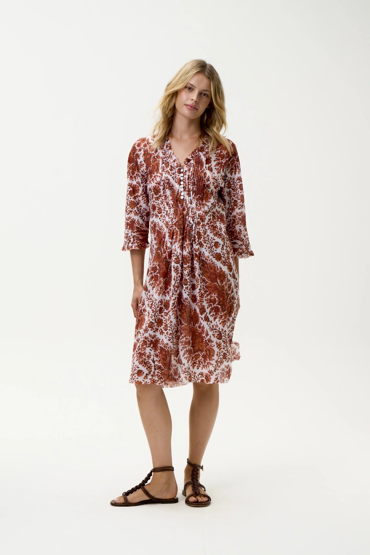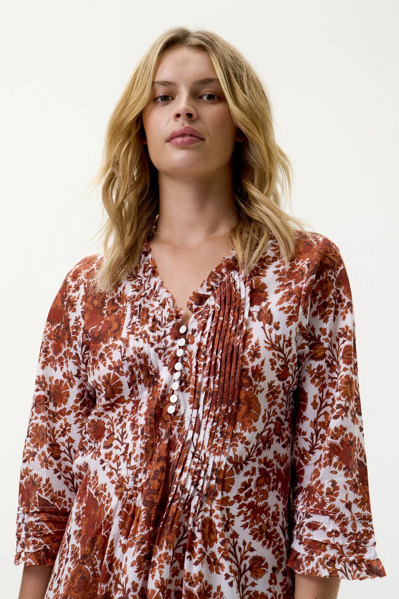 The Middy Poppy is our longest standing and most loved style. A true summer essential, the style is cut from 100% washed cotton and complements all body shapes with a flattering, looser silhouette. It’s finished with delicate raw ruffles around the neckline and sleeves and sits just below the knee.
