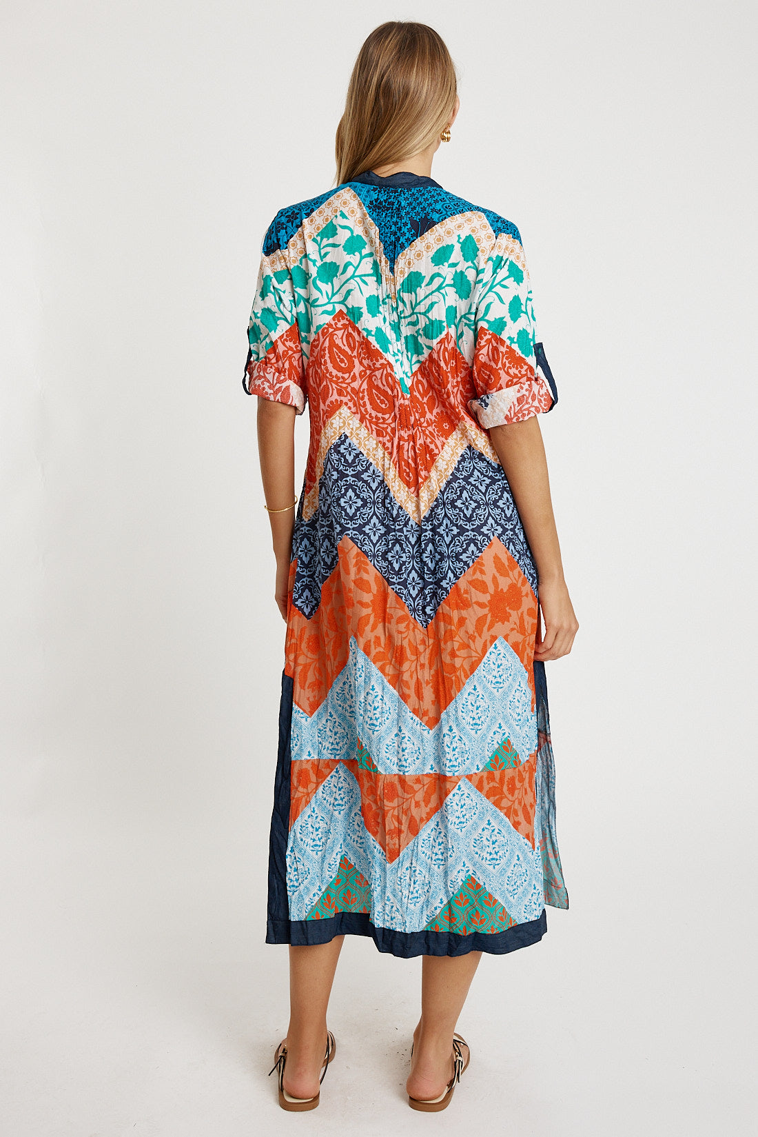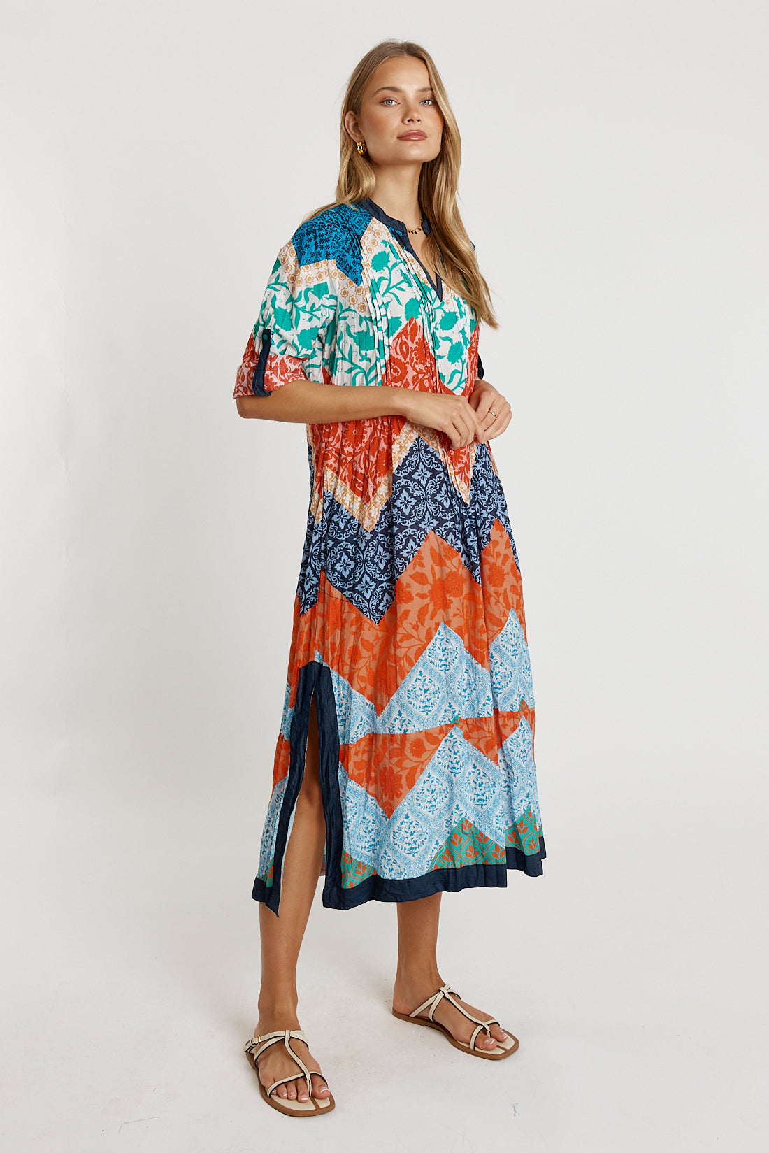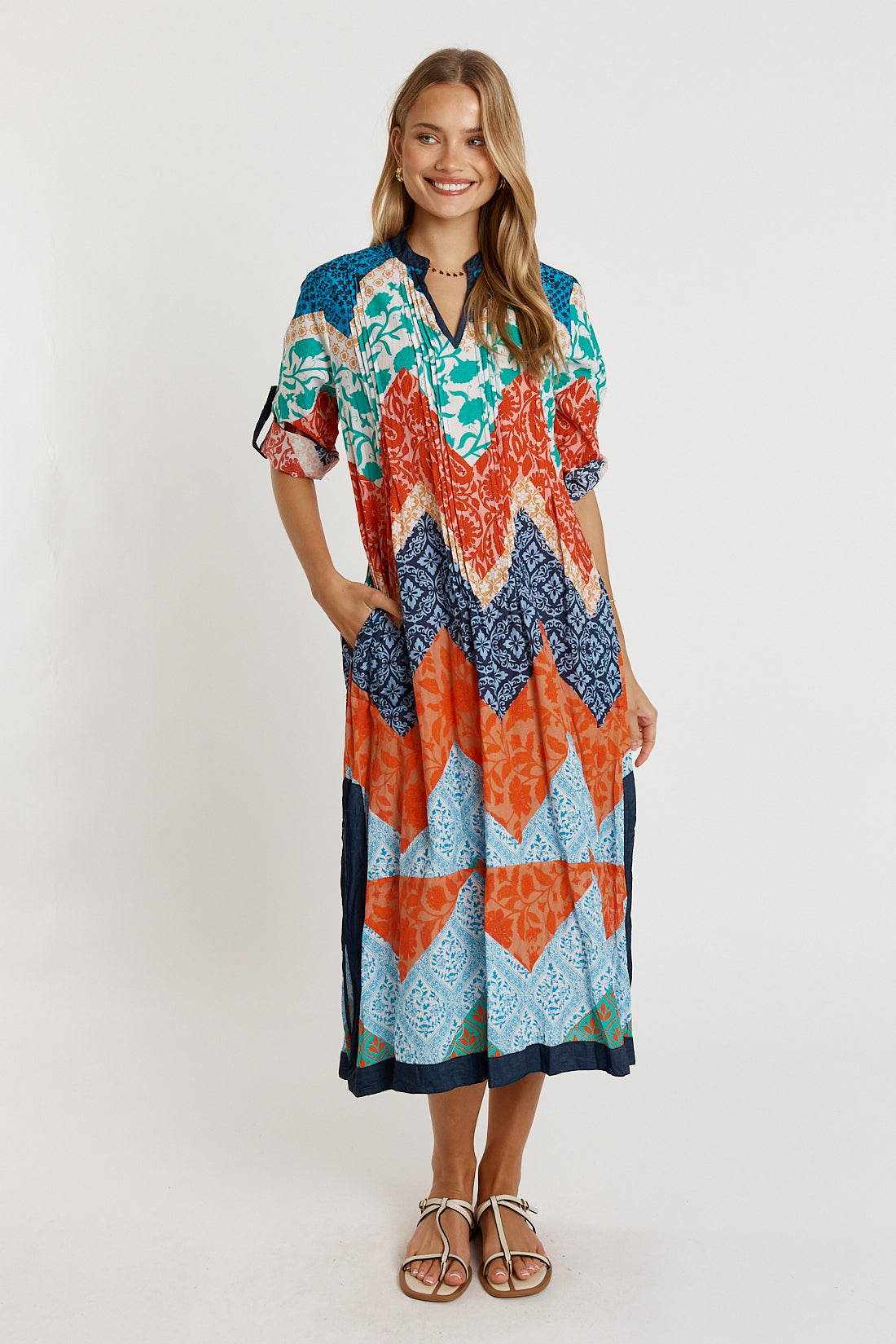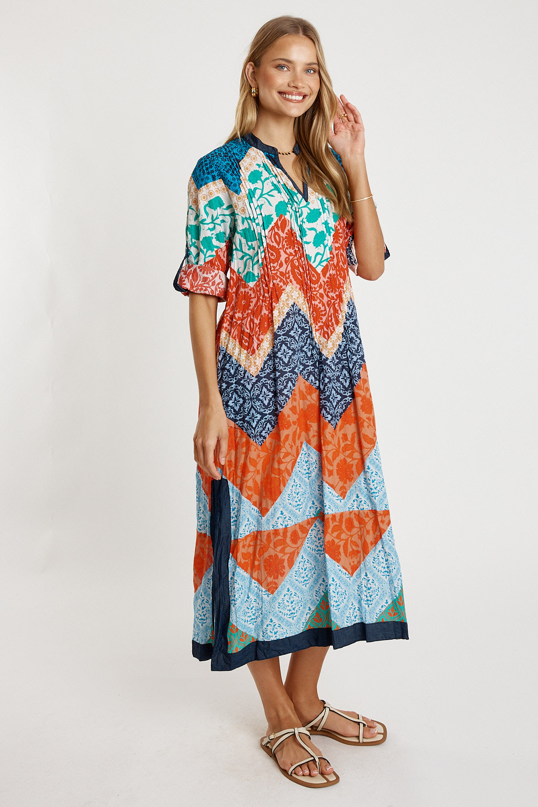 A breezy statement kaftan in LulaLife’s chevron patchwork print. The relaxed A-line falls to a swishy midi, while a banded V-neck and pintuck detailing elevate the easy silhouette. Roll-tab sleeves and in-seam pockets keep it practical for everyday wear, holidays and long lunches alike. Lightweight, breathable fabrication for effortless summer dressing.