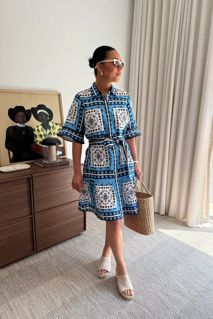 the submerge dress offers an easy-fitting silhouette finished with a tiered hem and softly fluted cuffs. a wide self-tie belt shapes the waist, while the distinguished scarf print, inspired by travels abroad, brings vibrance and individuality. designed for versatility, it’s a piece as suited to everyday wear as it is to resort escapes.