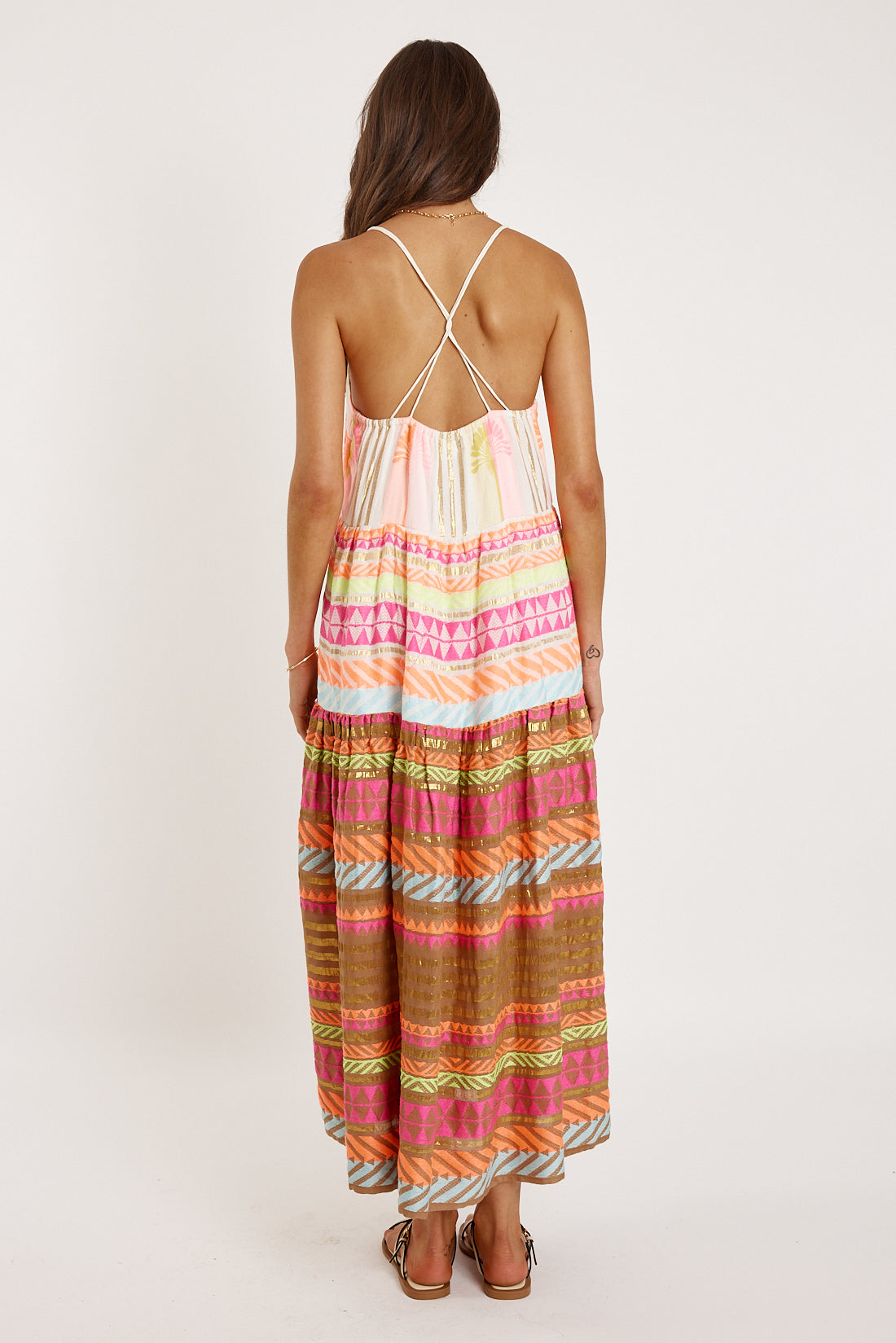 A radiant celebration of color and craftsmanship, the Rubyyaya Paloma Strap Maxi is your go-to for effortless summer elegance. Designed in Australia, this flowing silhouette features a kaleidoscope of tribal-inspired patterns in sunset hues—think warm pinks, earthy browns, and lush greens—woven into soft jacquard with subtle lurex highlights that shimmer as you move. Whether you're beach-bound or brunch-ready, this dress brings bohemian charm with a luxe twist.