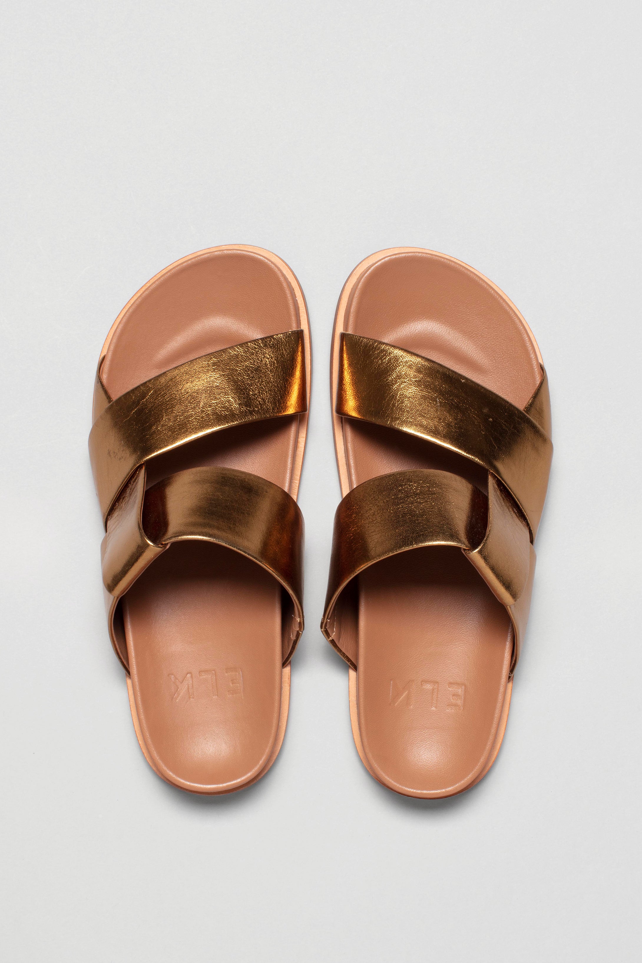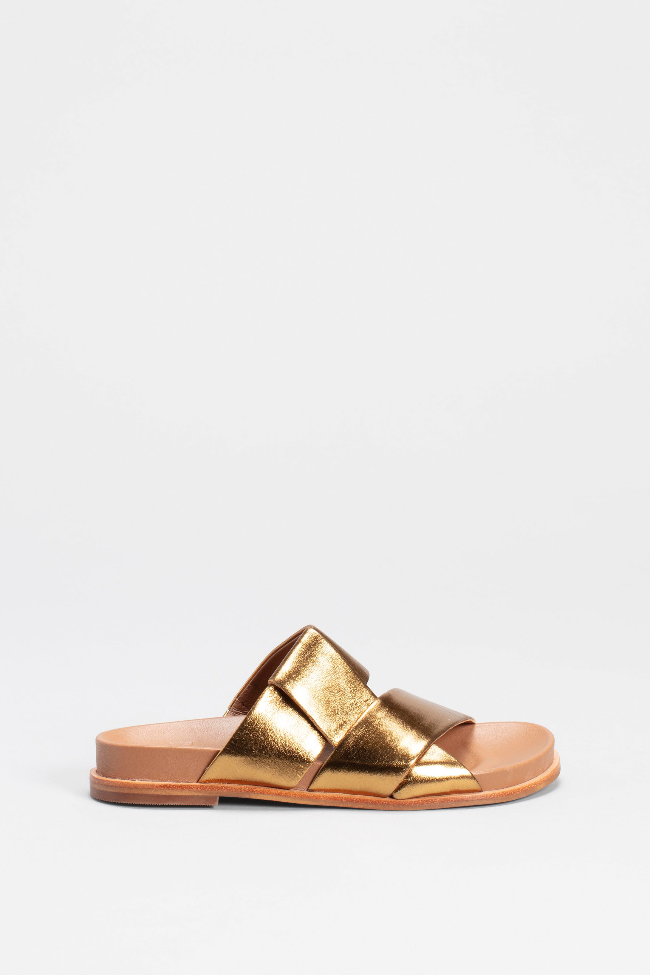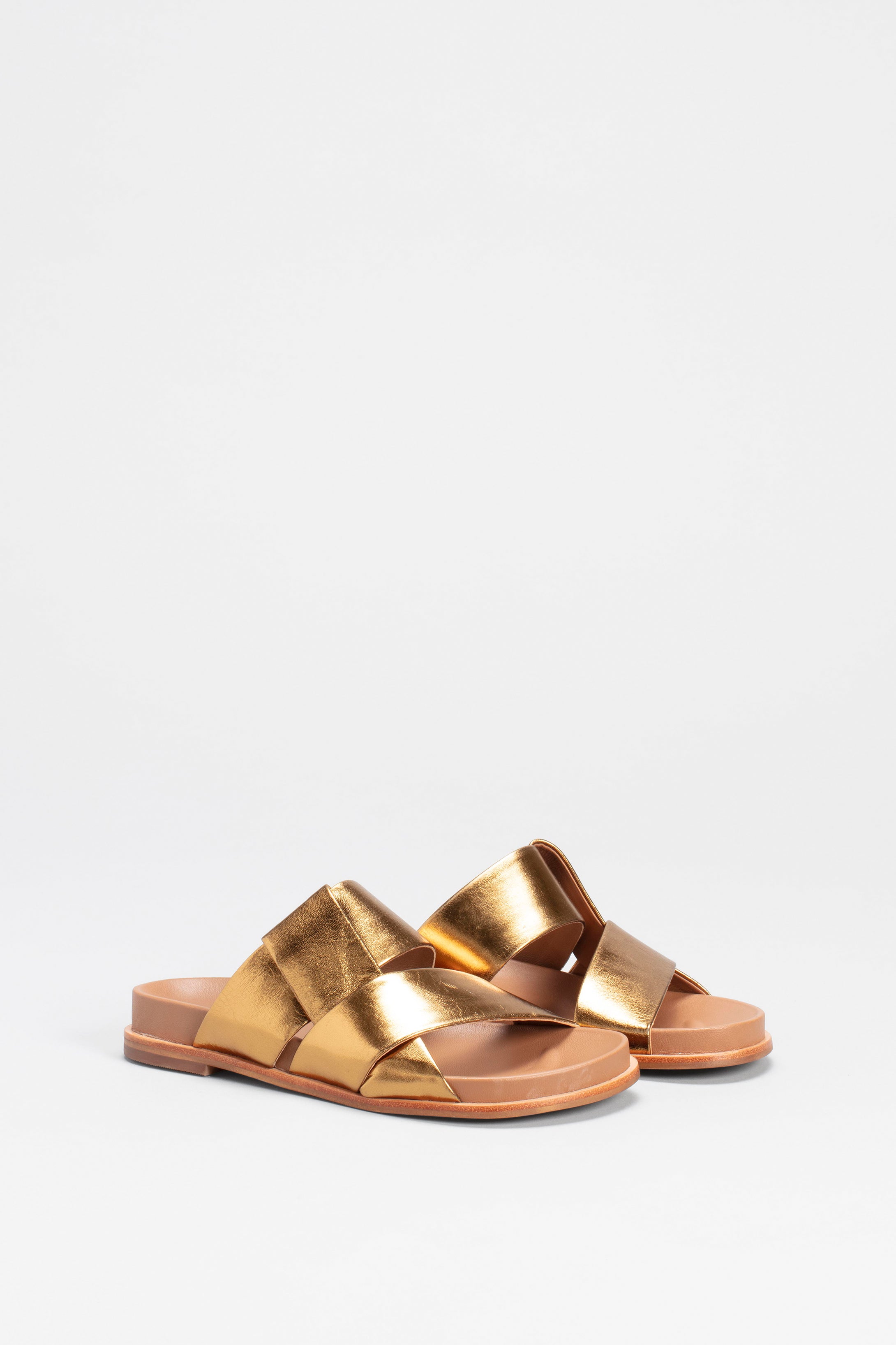 The Uma Slide is a style that will brighten any outfit, coming in two metallic colourways and a matte black leather. The slide features a crossover strap design and a moulded footbed.