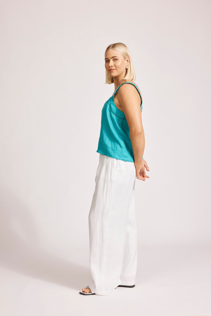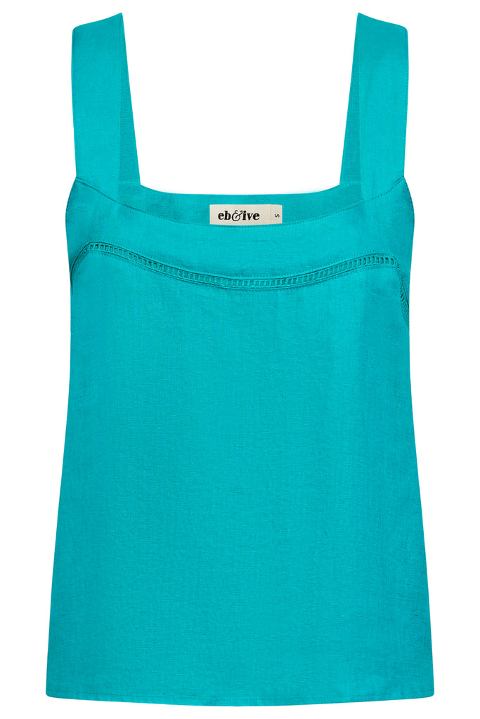 A timeless warm-weather essential. Crafted from 100% linen for breathable comfort. Features a square neckline, wide shoulder straps, and ladder lace trim detail. Designed in a structured, slightly cropped silhouette.