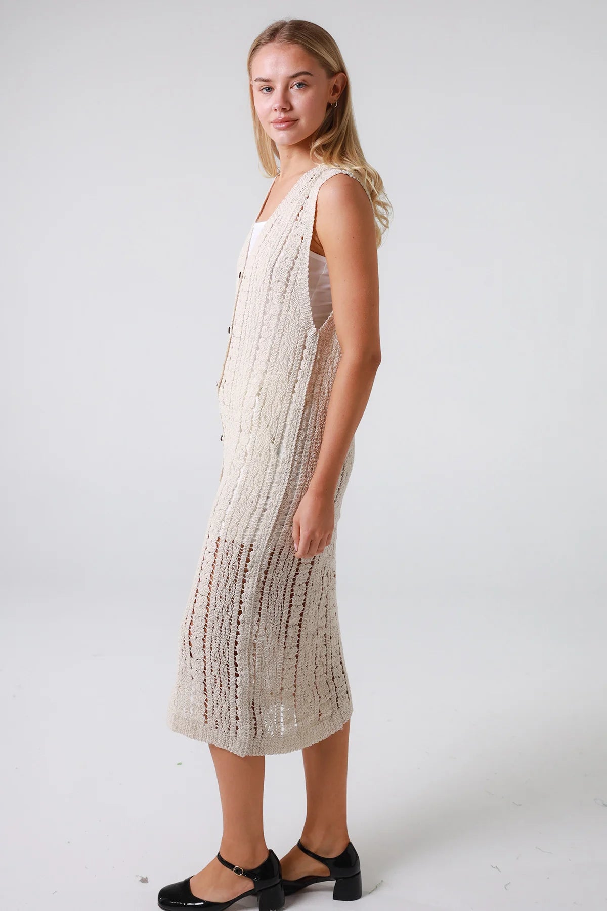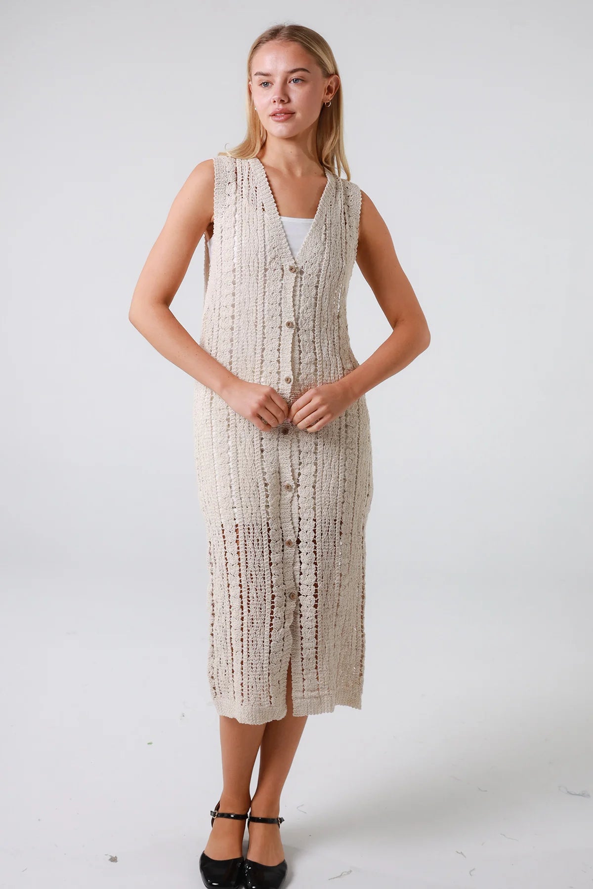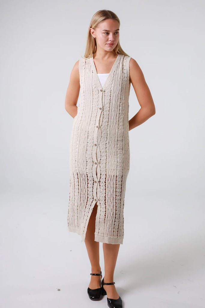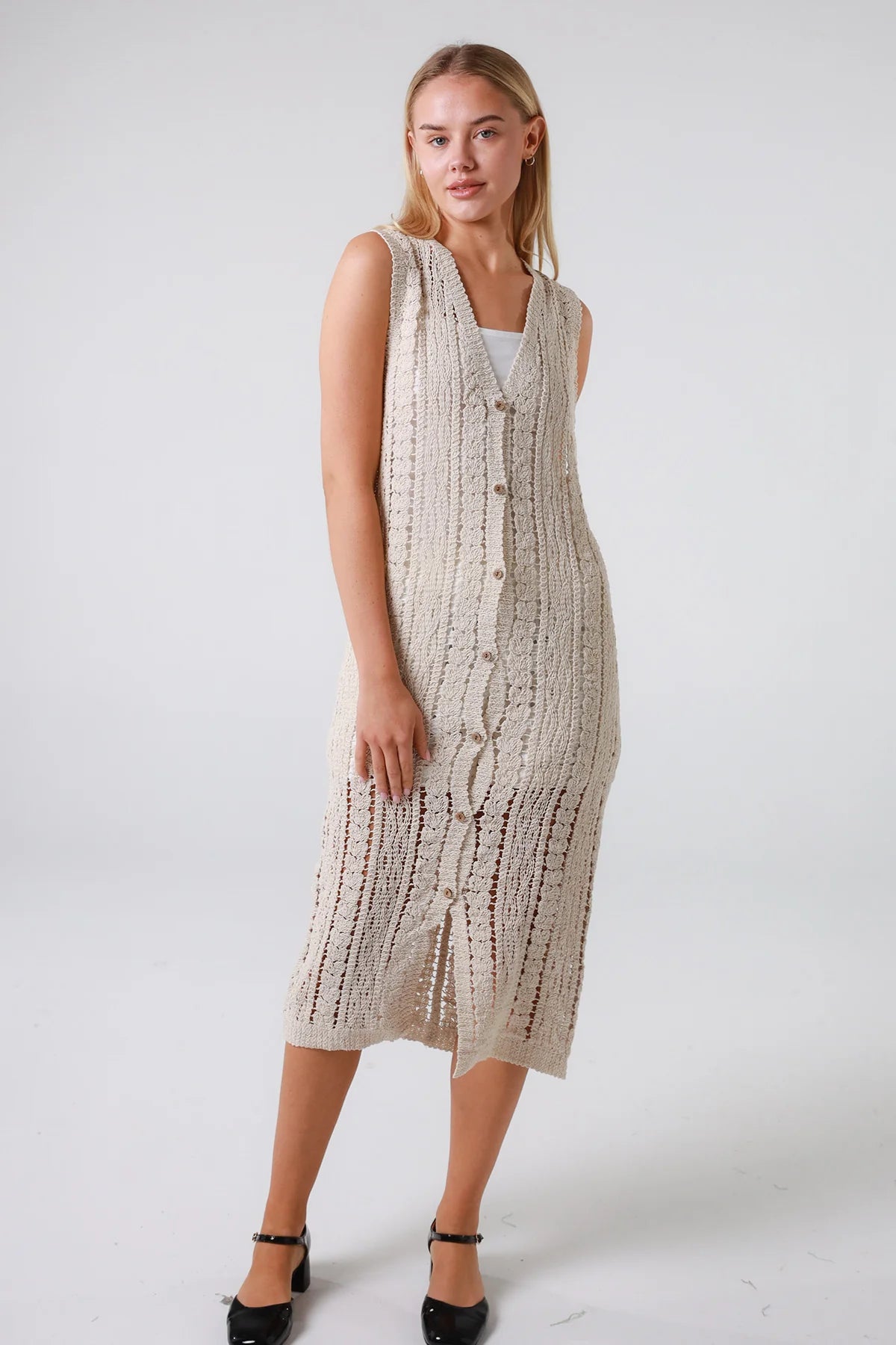 The Shoreline Crochet Dress from Isabella The Label is a summer essential with effortless charm. Crafted in an open-knit crochet design with a sleeveless cut and button-down front, it’s perfect for layering over a slip or swimwear. The natural beige tone and breathable weave make it ideal for beach days, resort escapes, or relaxed weekend styling.
