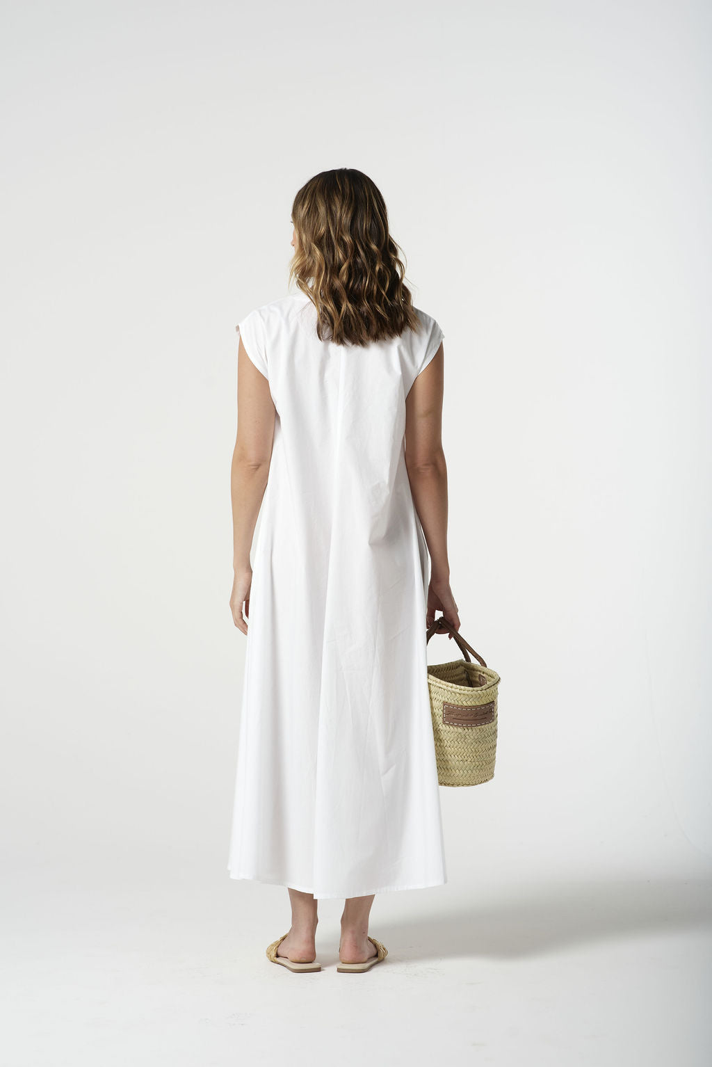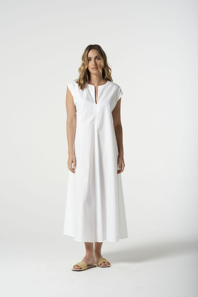 Effortless and versatile, this Goondiwindi Cotton dress is crafted from 100% cotton for a lightweight, breathable feel. Designed with a flattering V‑neckline, cap sleeves, and a relaxed, ankle‑grazing silhouette, it’s perfect for warm days and easy layering. Available in crisp Optical White or soft Sage Green for timeless, go‑anywhere style.