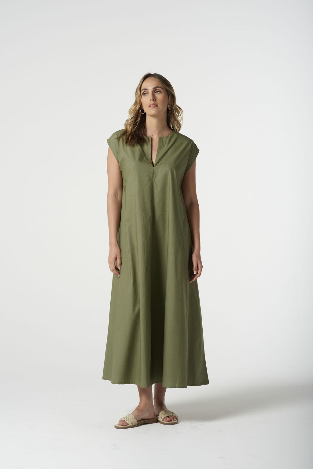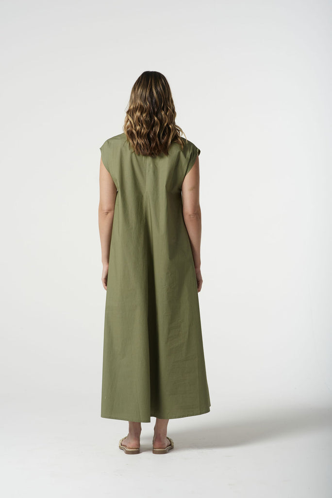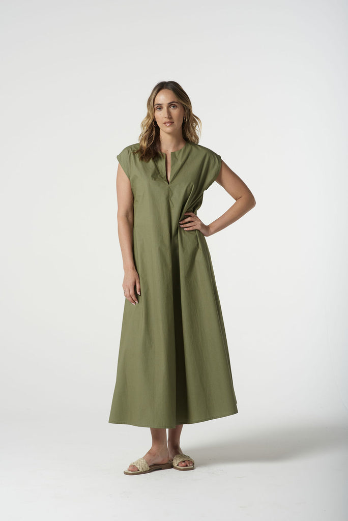 Effortless and versatile, this Goondiwindi Cotton dress is crafted from 100% cotton for a lightweight, breathable feel. Designed with a flattering V‑neckline, cap sleeves, and a relaxed, ankle‑grazing silhouette, it’s perfect for warm days and easy layering. Available in crisp Optical White or soft Sage Green for timeless, go‑anywhere style.