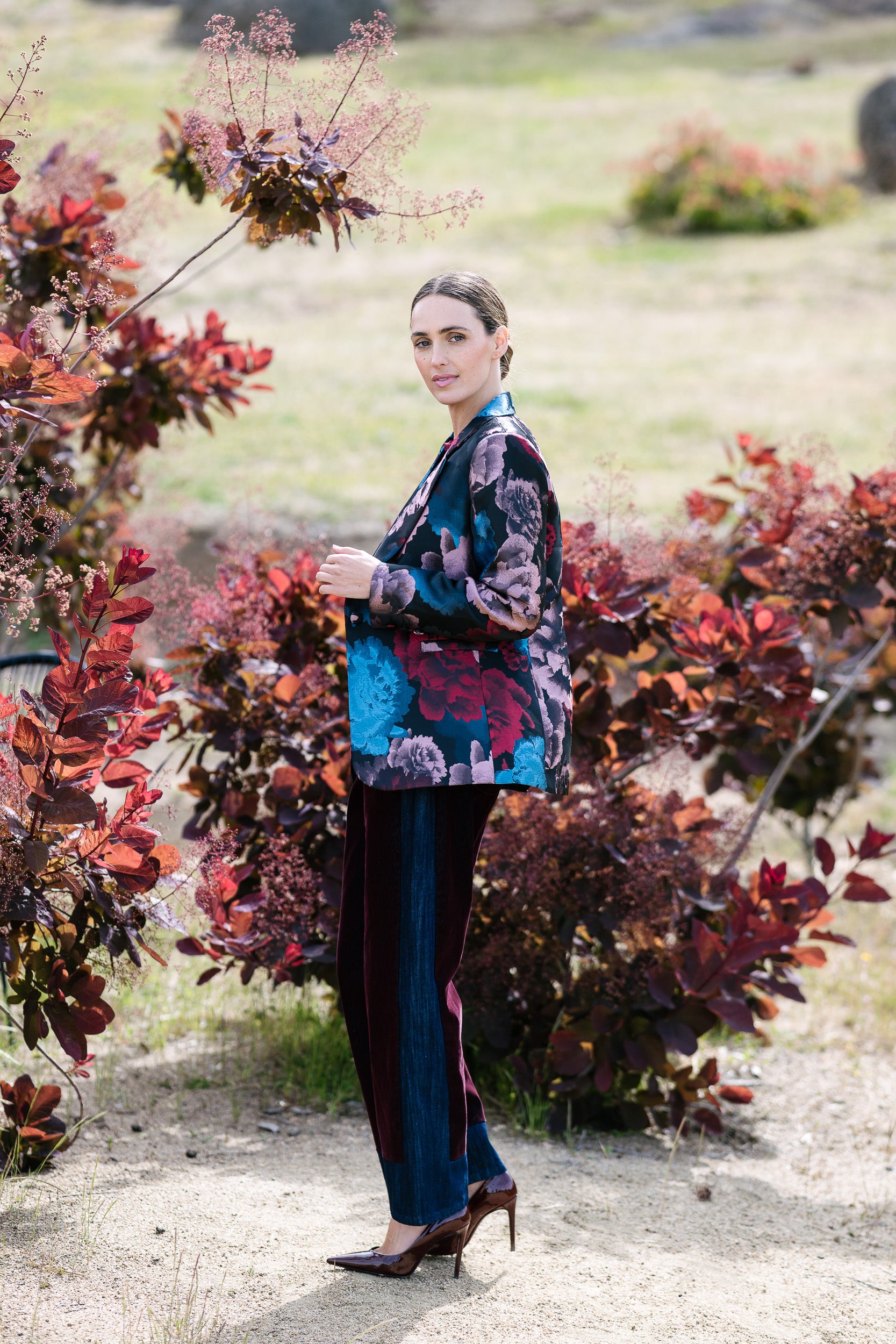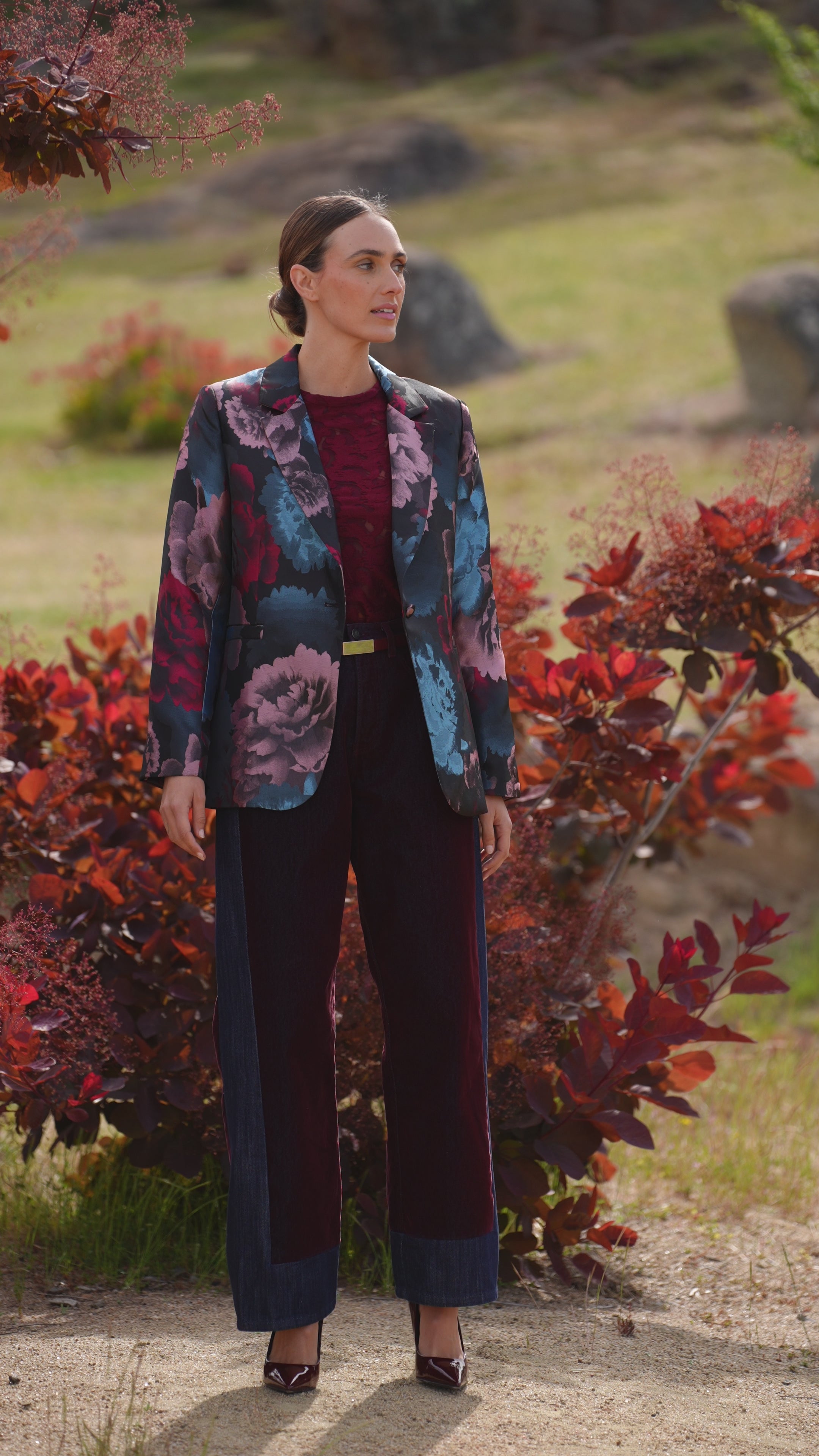 Thoughtful details like the front pocket with intricate trim elevate the design, making it perfect for both polished daywear and elevated evening occasions. Fully lined for a smooth, indulgent feel, the Zazzle Jacket is where bold colour meets couture craftsmanship. Pair it with the Darling Pants in matching Midnight Roses for a striking co‑ordinated set.
