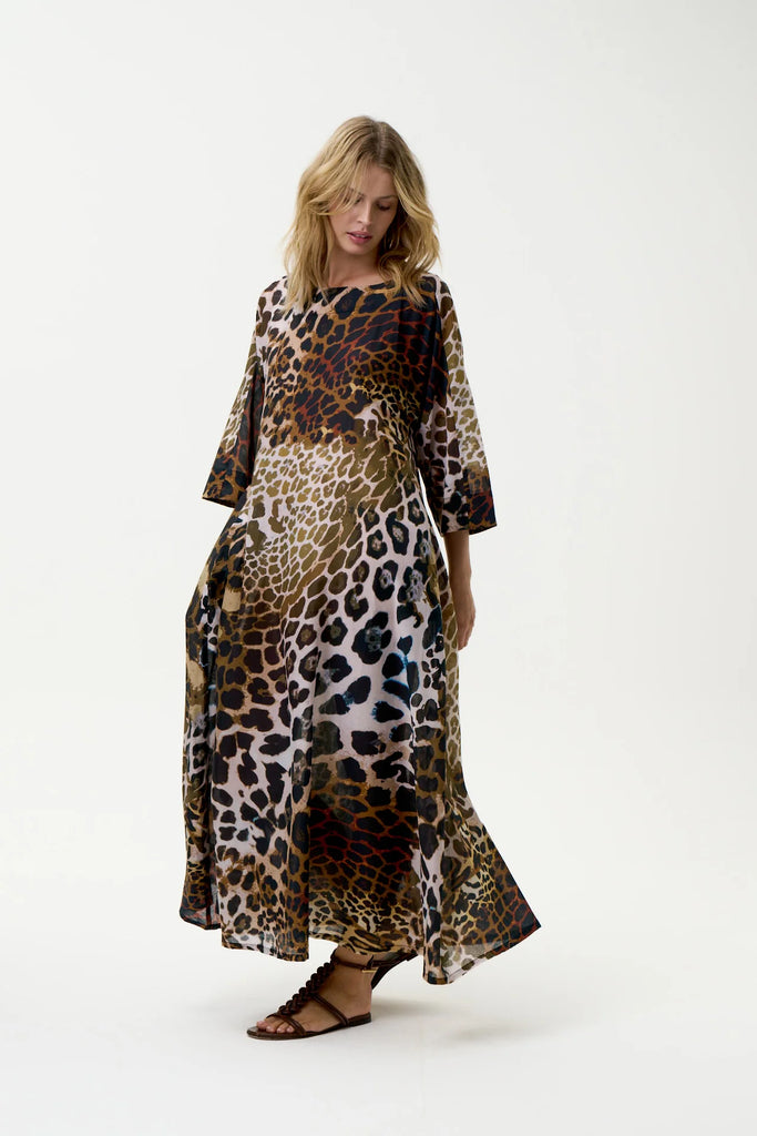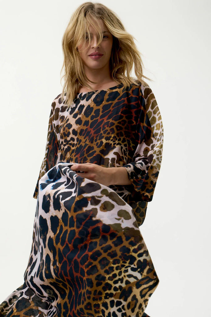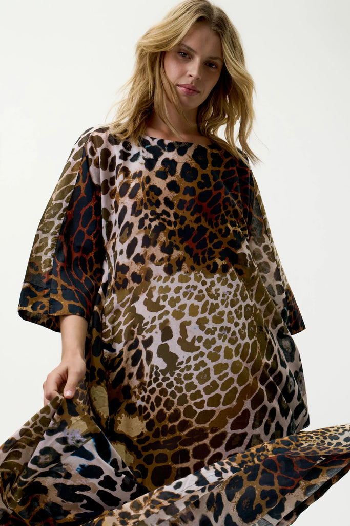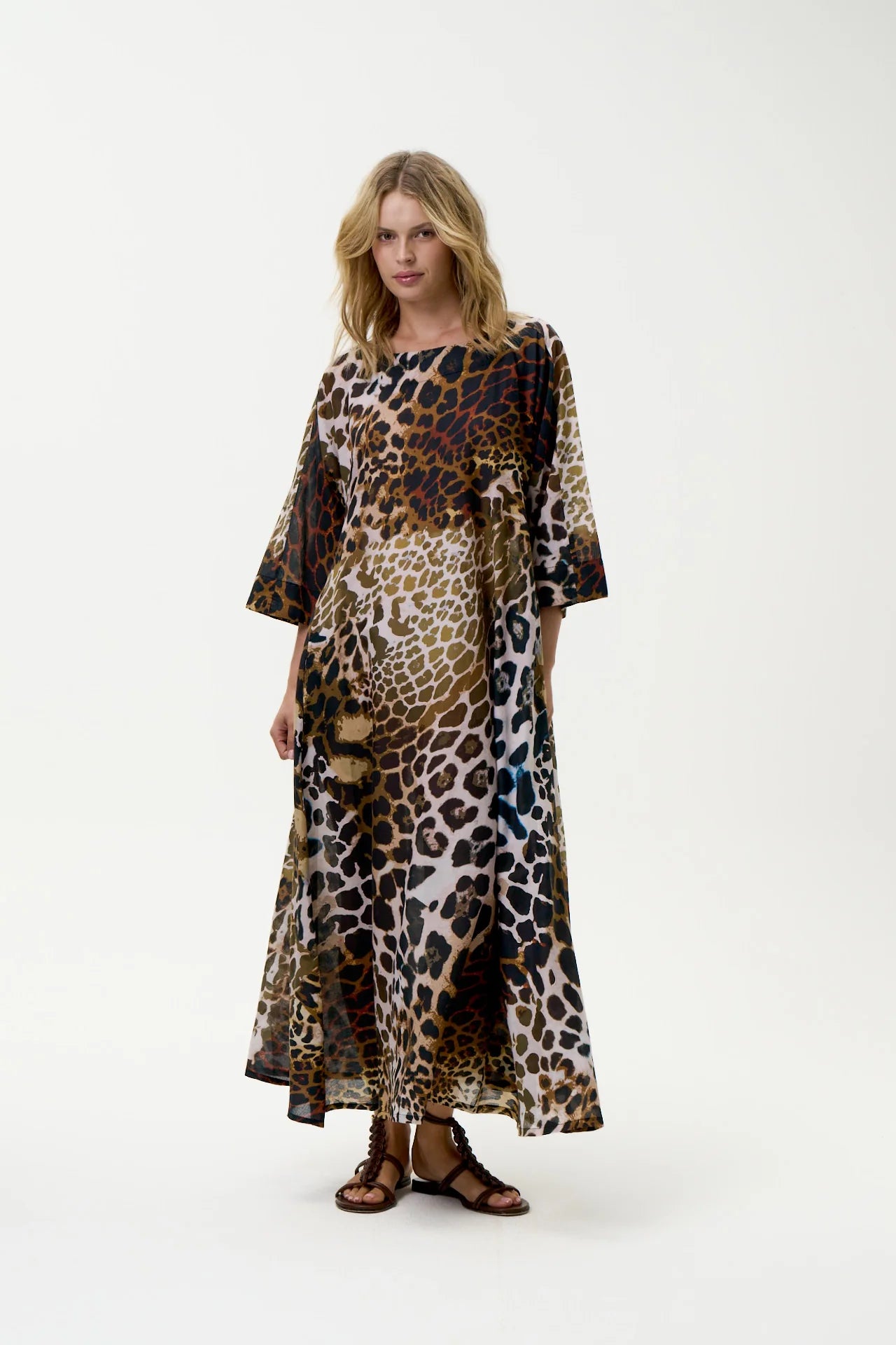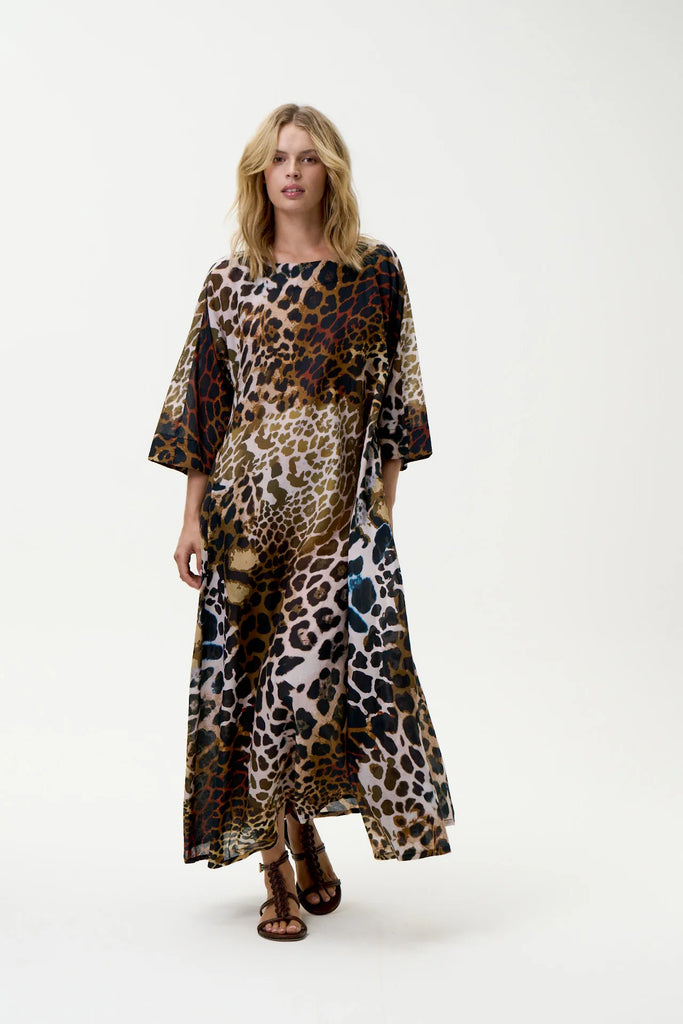 The Jackie is a floaty silhouette designed for easy summer days. Featuring a soft scoop neckline, ¾ sleeves, and a flared hem, it offers a lightweight feel and effortless drape, the perfect cover-up for holiday escapes.