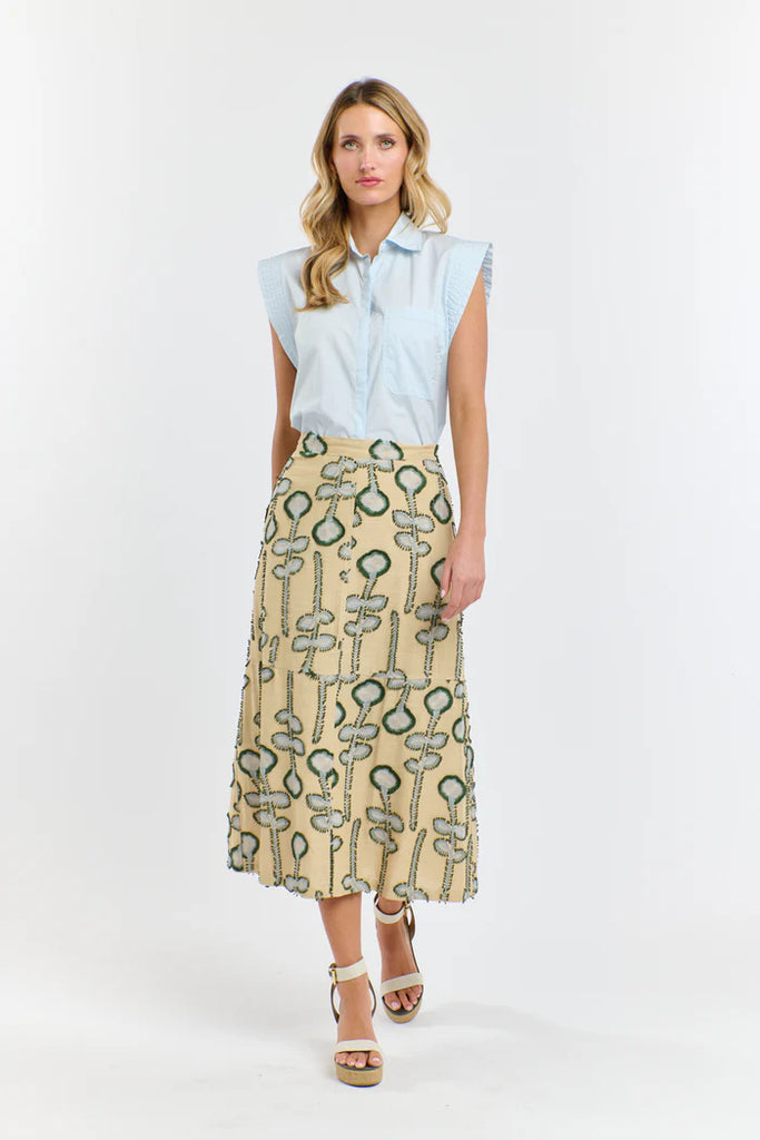 Textured and feminine, the Eden Embroidered Skirt adds stylish and distinctive embroidery to a light viscose–linen base. A soft tier creates movement through the midi length, while a flat front and elasticised back waist make the fit adjustable and comfortable. Style with a shirt or a simple tank and sandals for an eye-catching and wearable edit.