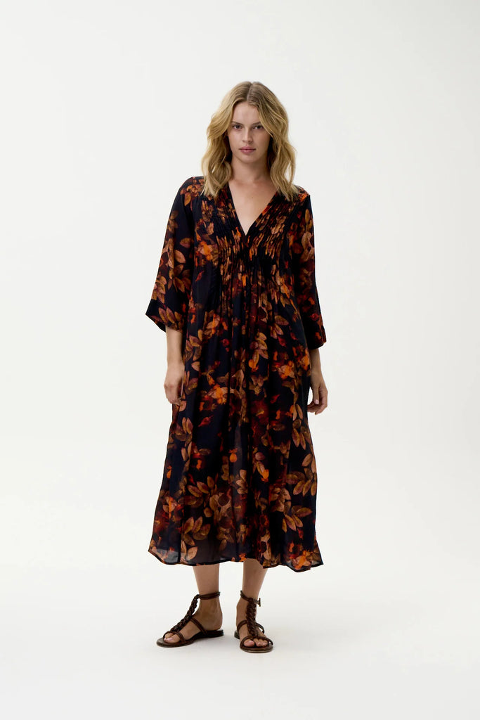 The Mia embodies balanced elegance. Free and flowing, it features a flattering pintuck bodice, ¾ sleeves and a plunging v-neckline.