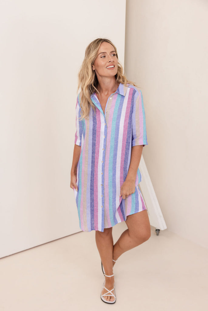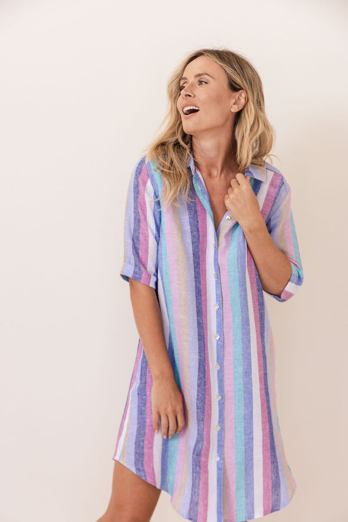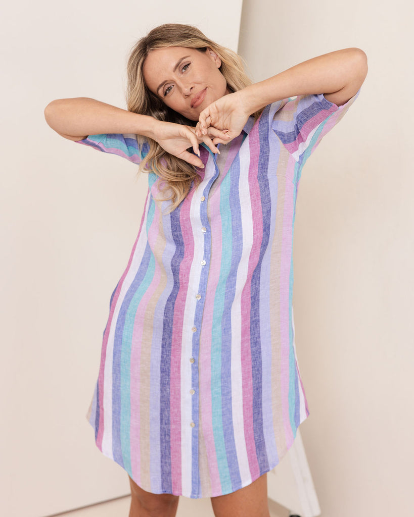 Button thru shirtmaker dress in vibrant pink & denim stripe