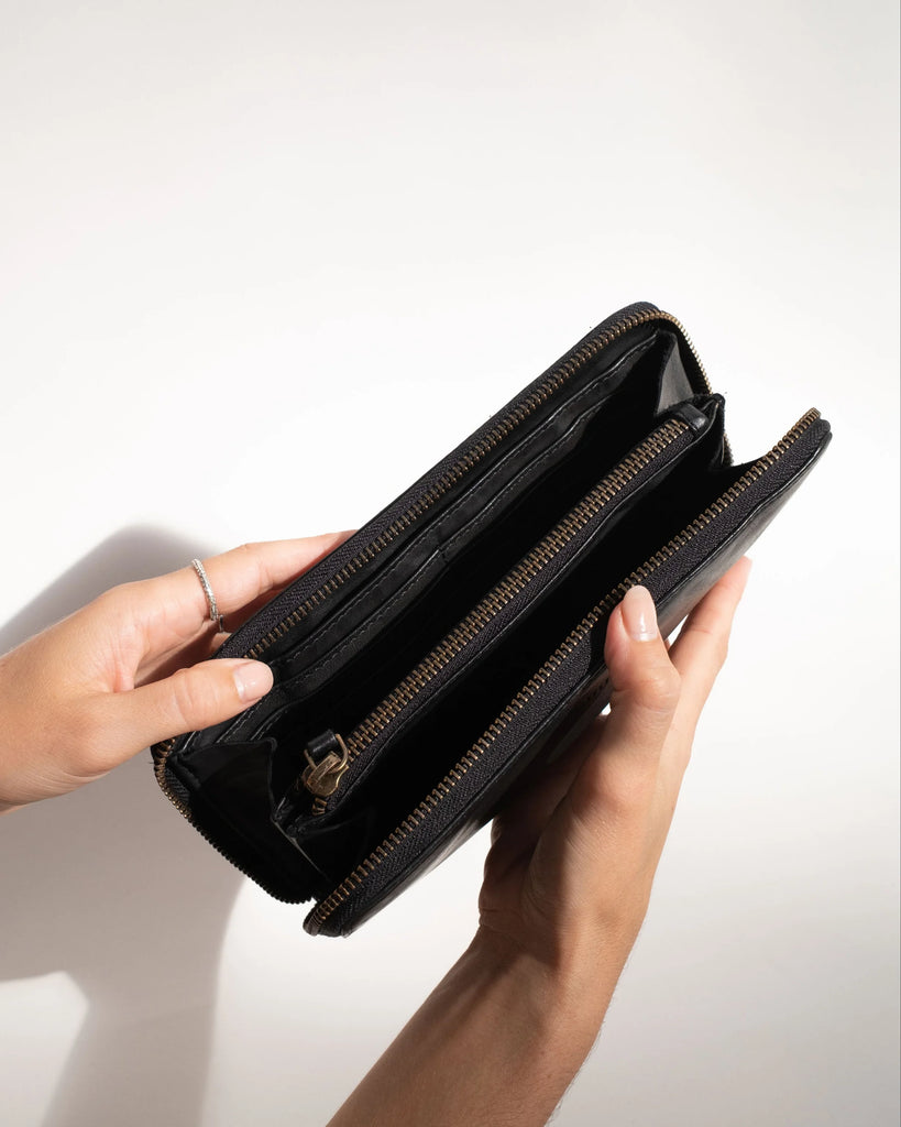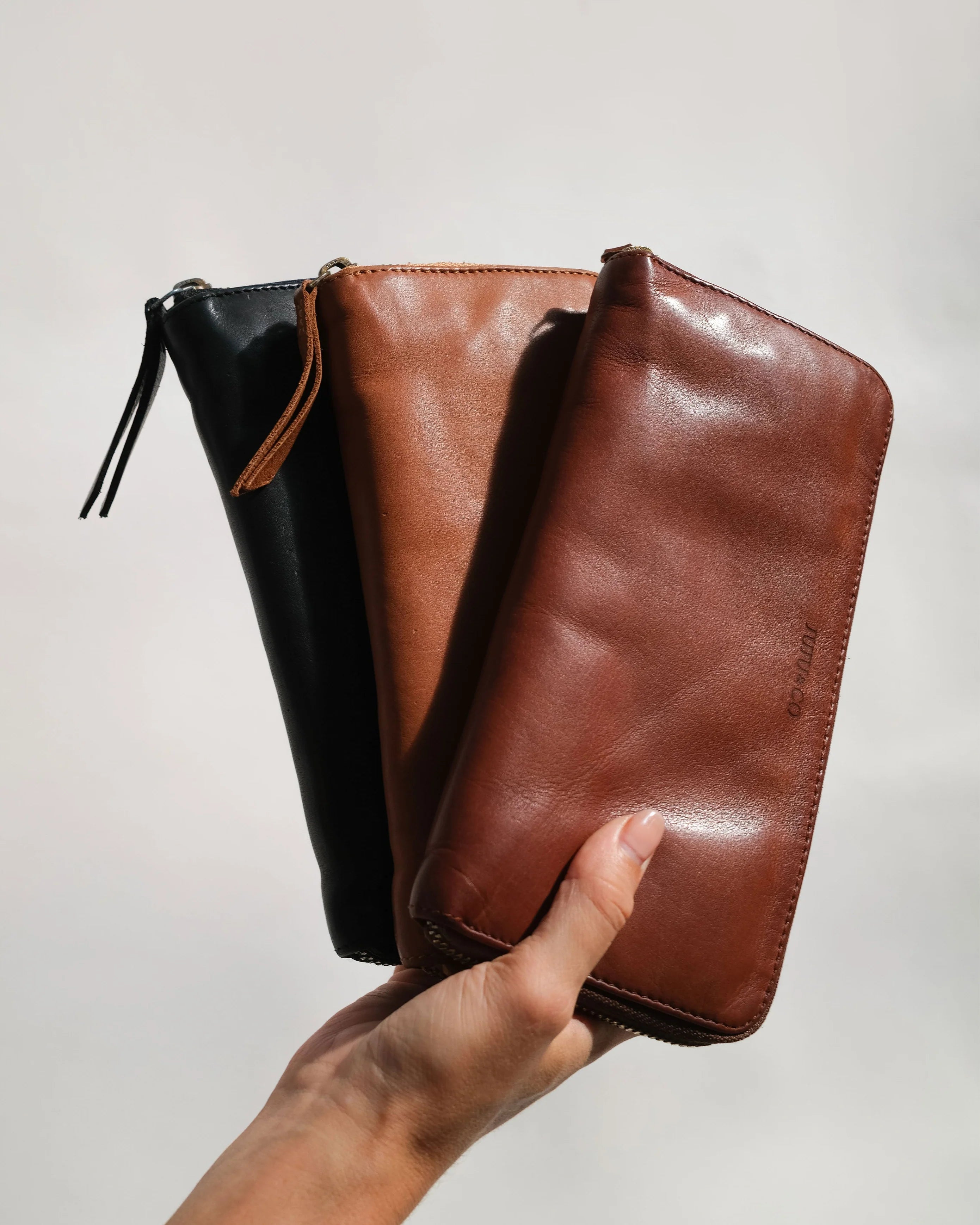 The Slim Wallet made from washed leather. Though light and compact, this wallet has a zip for security and can fit a standard phone. Can be used as a wallet or clutch.