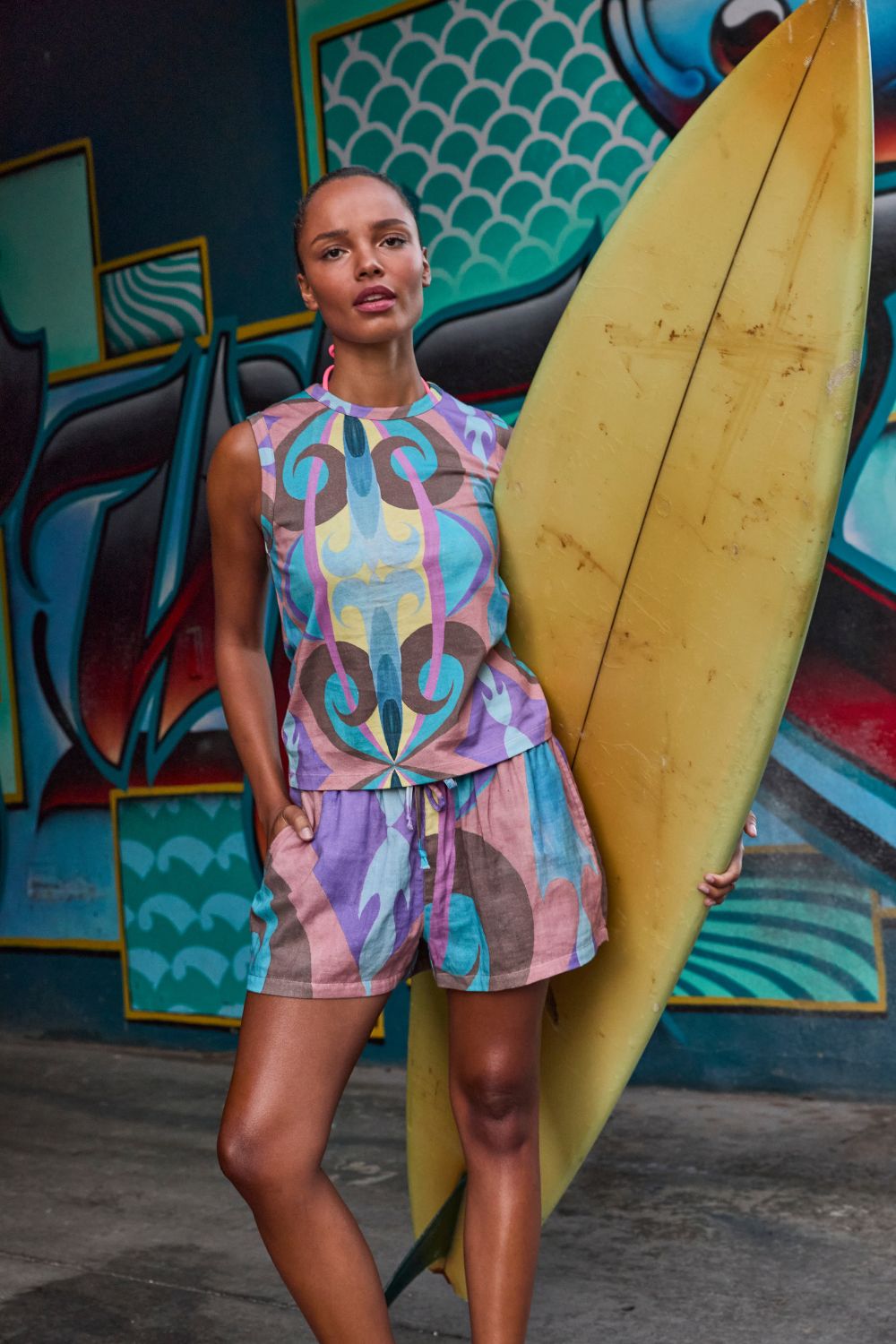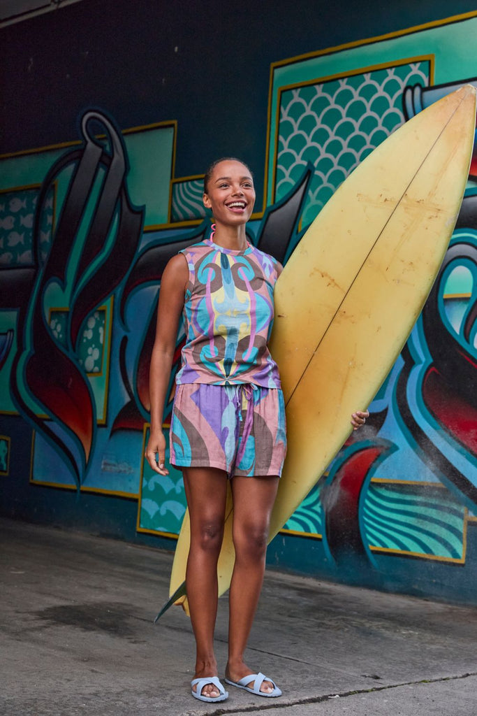 Bring vibrant energy into your wardrobe with the Violet Tank in the striking Wave print. Crafted from soft, breathable cotton, this sleeveless style features a clean crew neckline and a comfortable, true-to-size fit. The standout artwork — created exclusively by Circular by Maud Alice Dainty — gives the tank its bold, artistic edge. Perfect for warm days and easy styling, it’s a colourful piece that lifts any casual outfit.