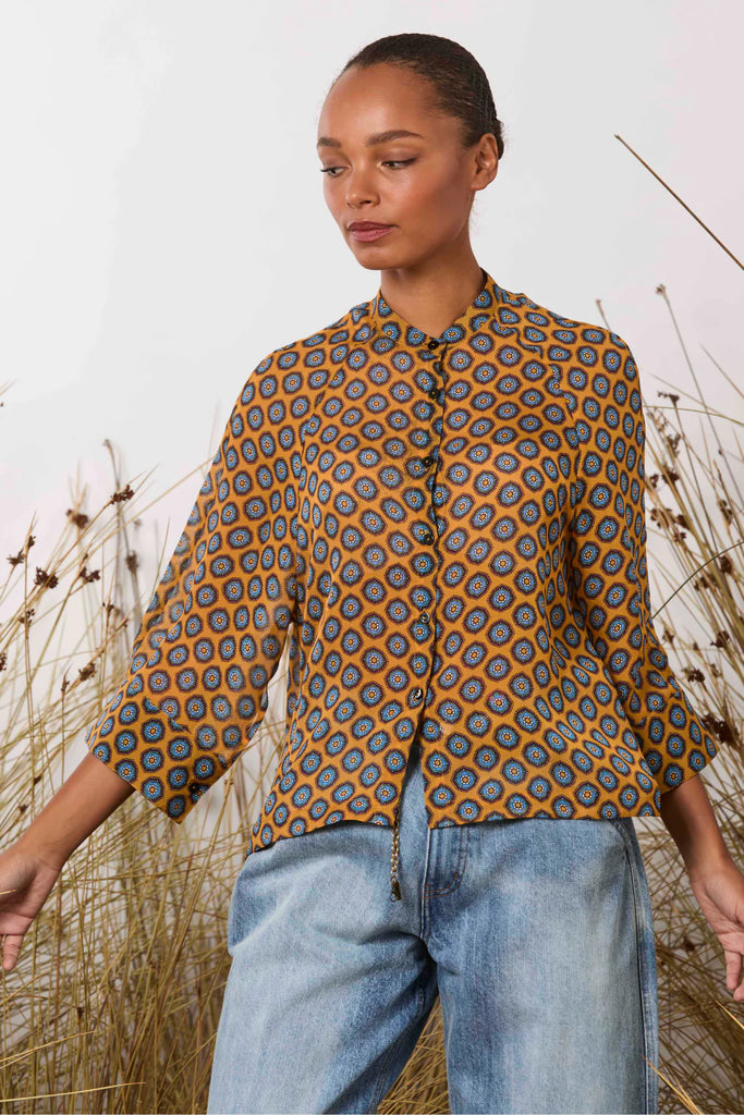 Bright, breezy, and effortlessly chic, the Sammy Top is a silk blouse adorned with an orange and blue floral print. Featuring a button-through front, mid-length sleeves, and a clean collarless neckline, this piece balances polished style with relaxed ease.