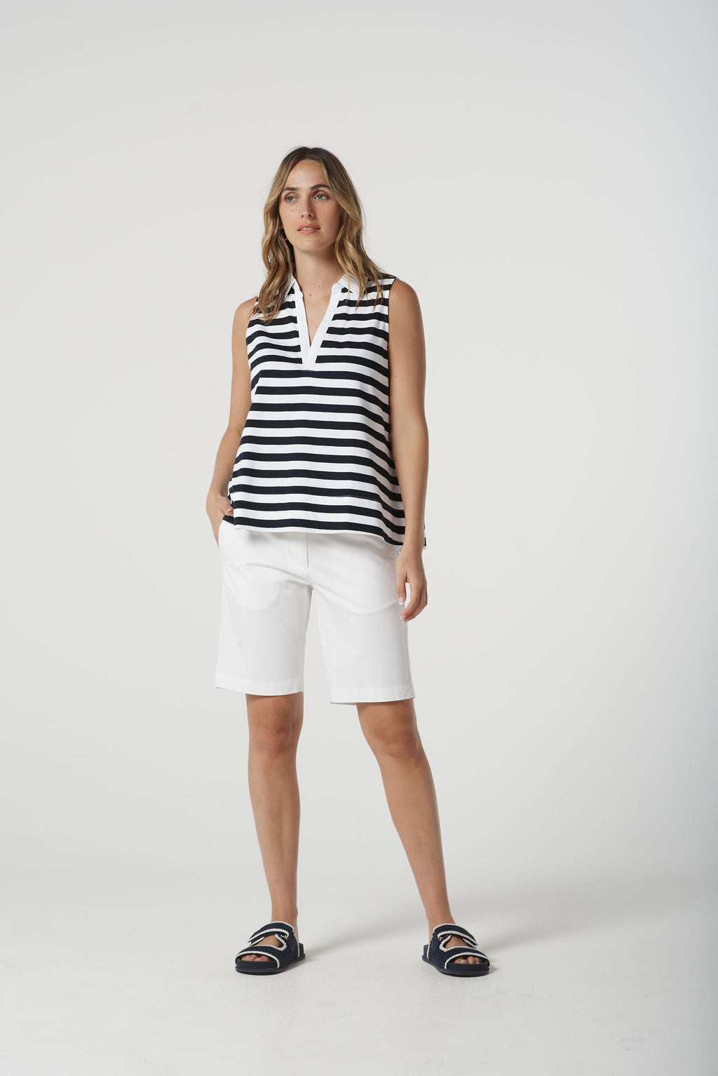 The Sleeveless Stripe Polo by Goondiwindi Cotton brings a fresh, sporty touch to your summer wardrobe. Crafted from premium cotton pima jersey, this sleeveless style is soft, breathable, and perfect for warm days. The classic stripe design and open polo neckline make it an easy choice for casual wear.