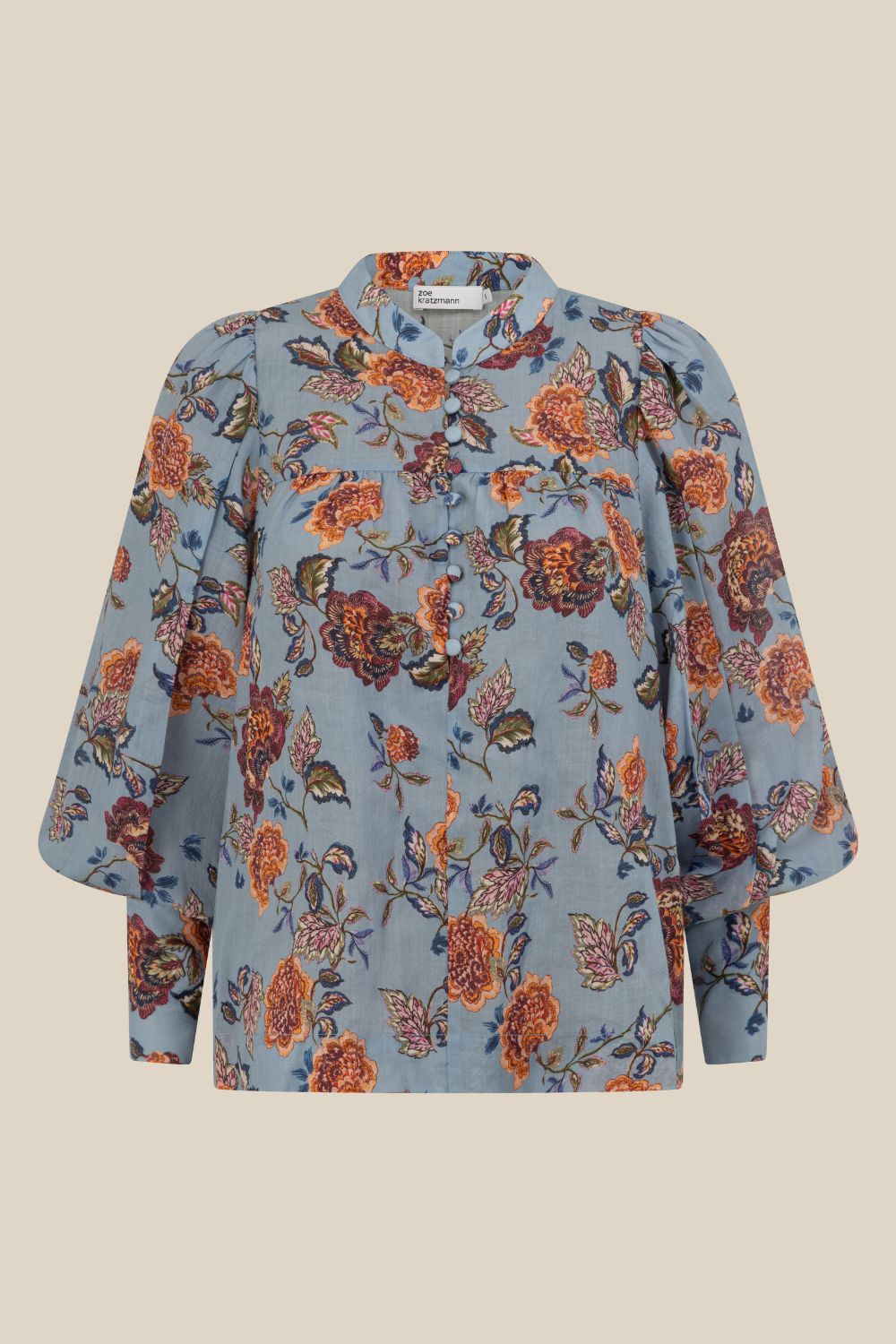 a refined transitional essential. the vista top balances softness and structure for effortless autumn–winter dressing. a cool blue base softened with warm florals, twilight bloom feels balanced, feminine, and easy to wear.