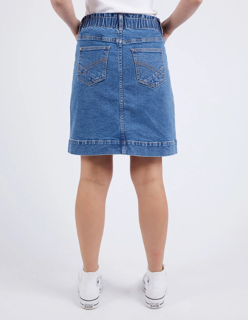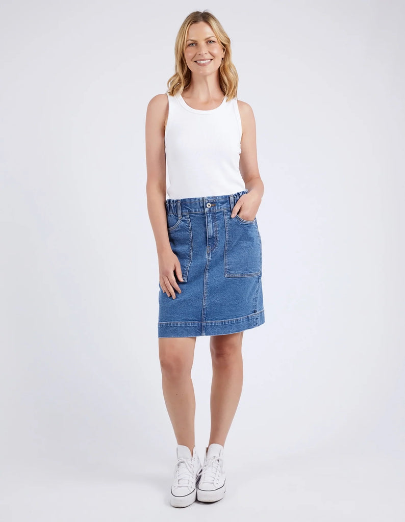 Comfort plus denim skirt for all day wear. The Atlas Denim Skirt features a comfortable elastic waist with front patch pockets and all the Elm denim bells & whistles.