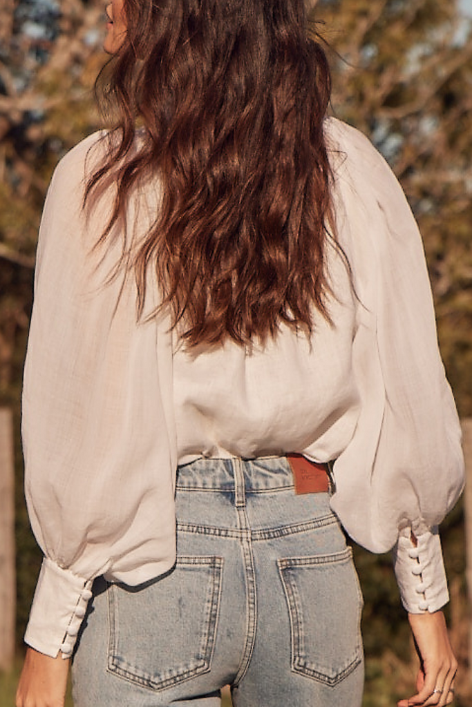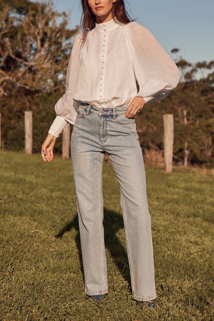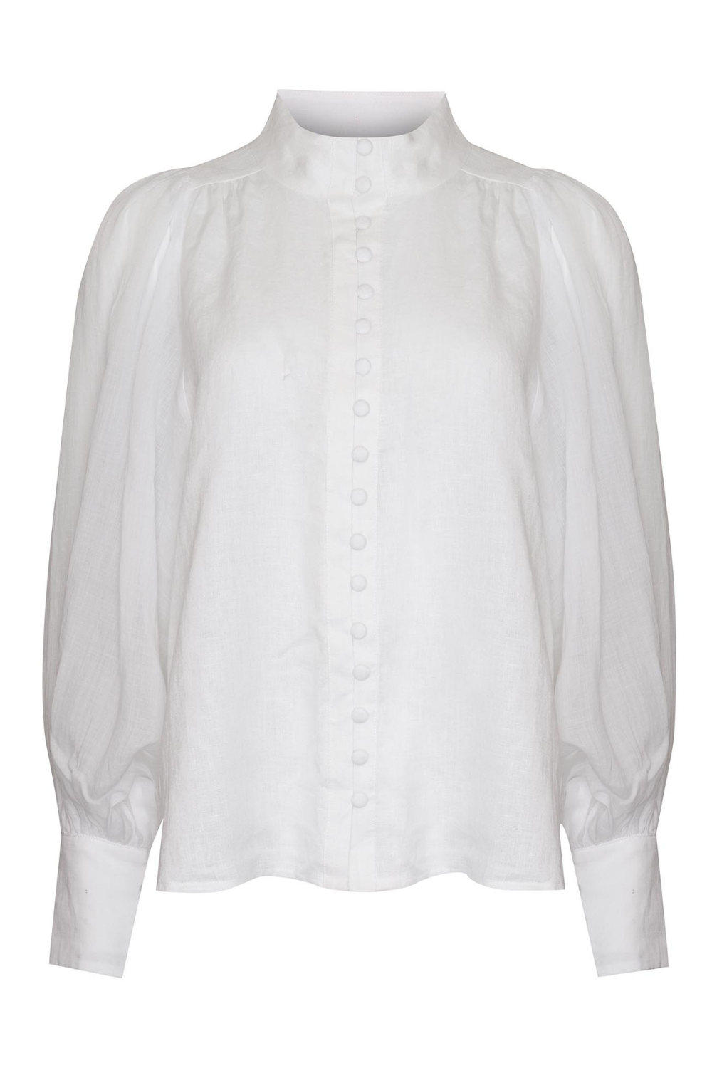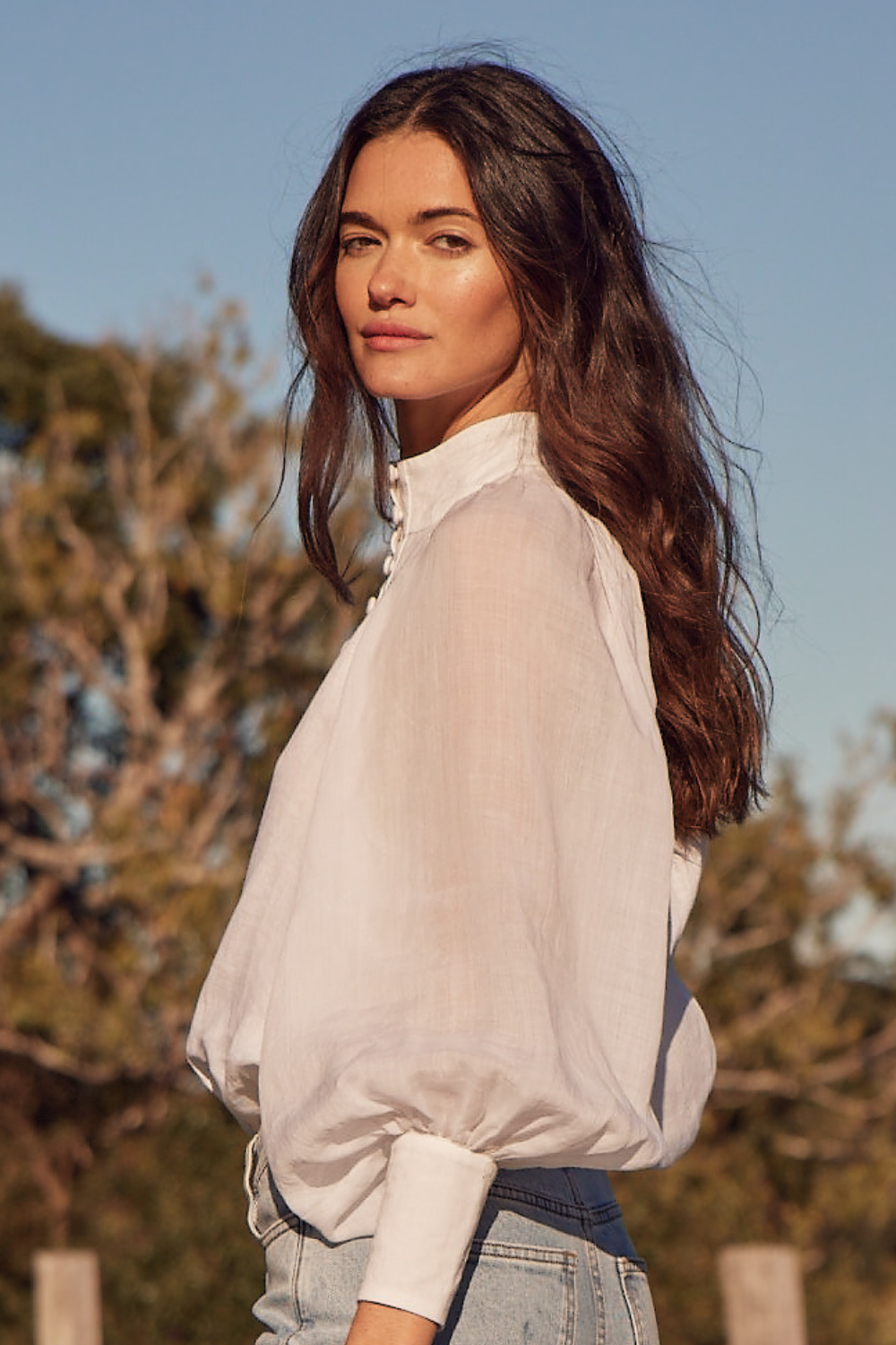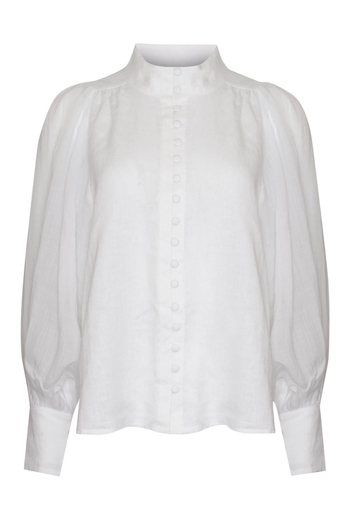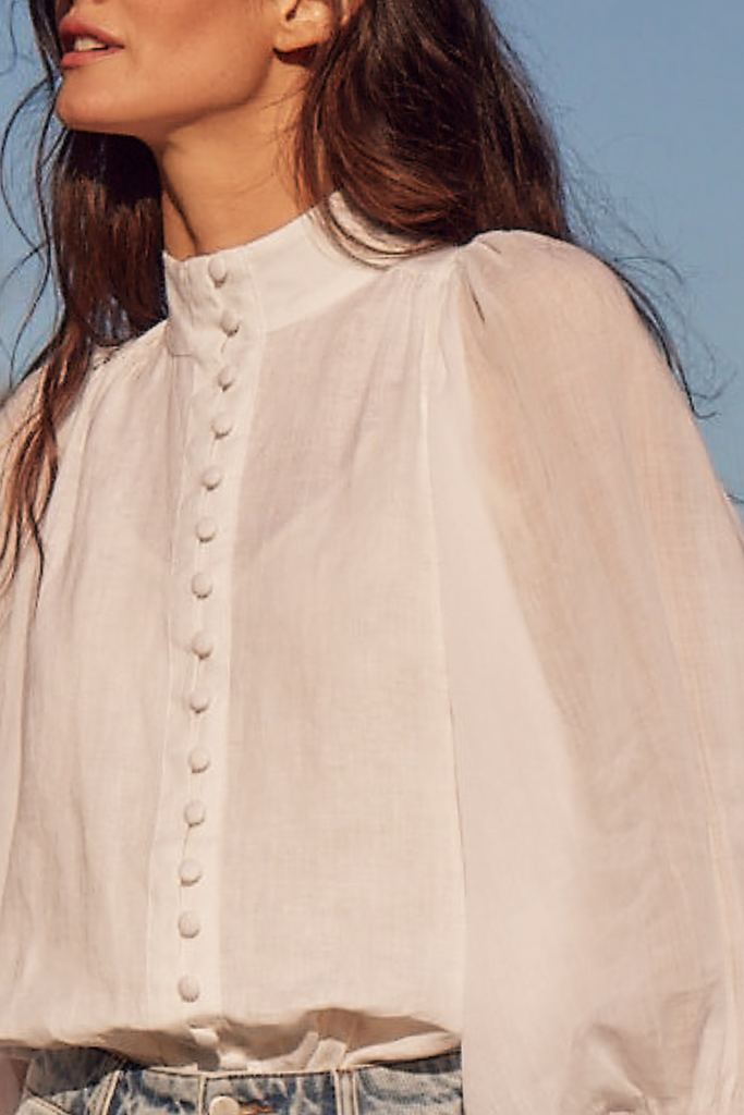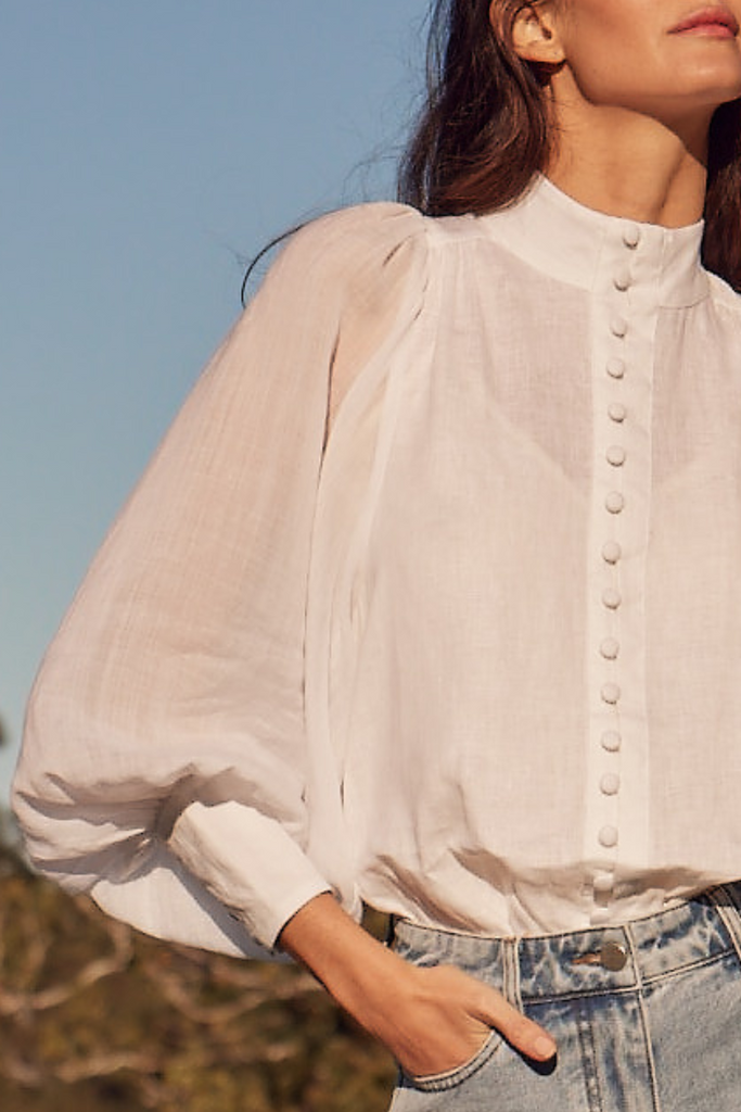 the atlas top is a study in structure and fluidity. with a mix of linen and sheer ramie, it balances a more solid looking bodice with airy extravagant sleeves. a high neckline lends a sophisticated iteration of vintage-inspired elegance. covered buttons are secured with rouleau loops to further create a refined and feminine piece.