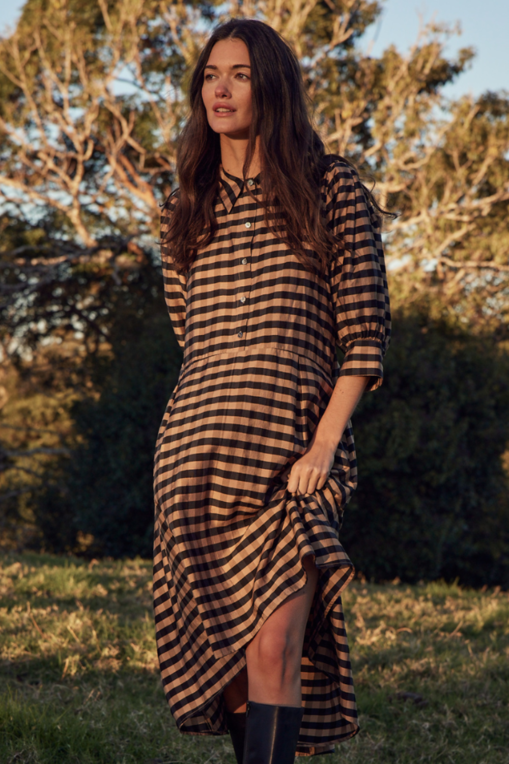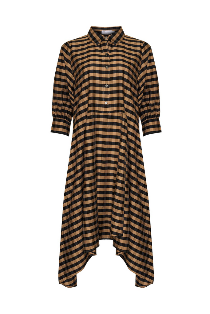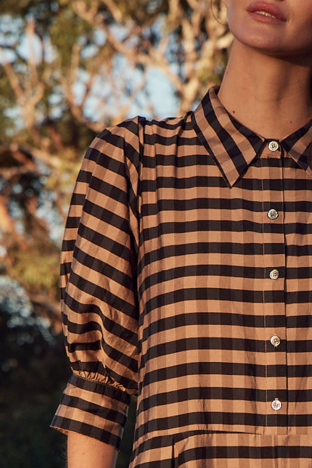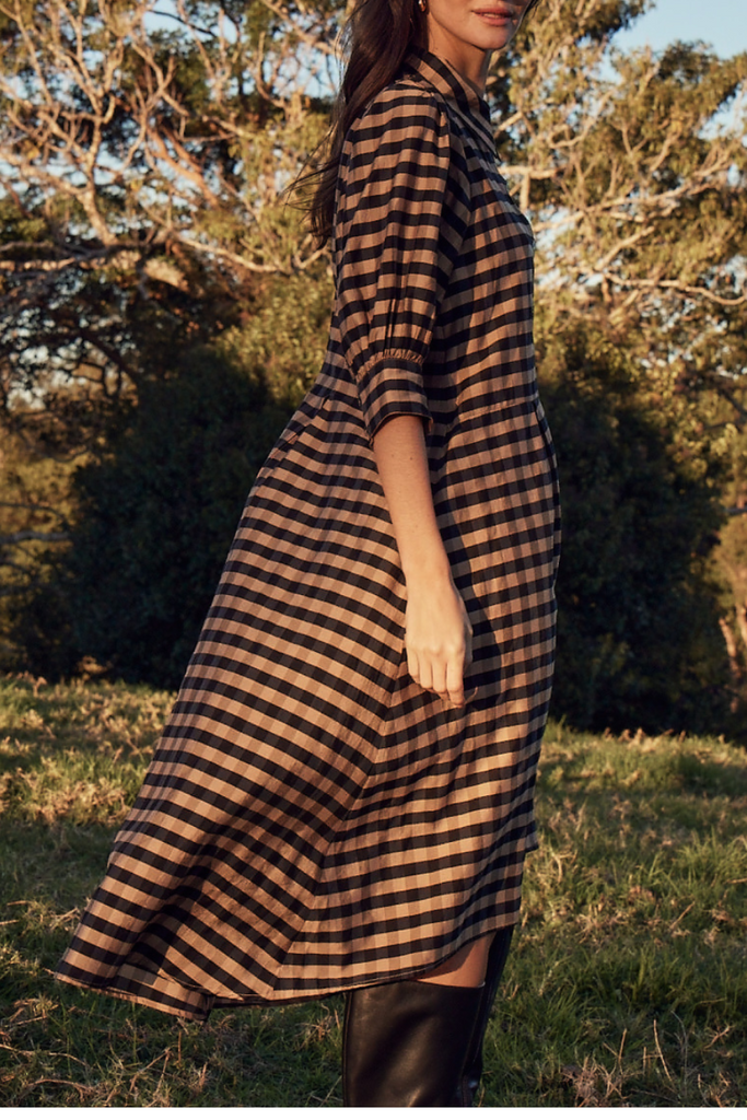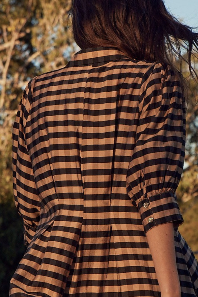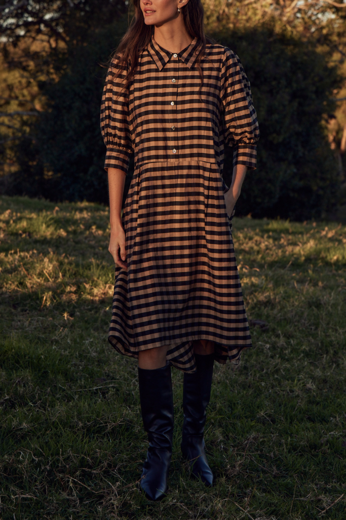 rendered in a striking toffee black check, the befit dress is crafted from a rayon-tencel-nylon blend that’s been washed for a softer, modern hand feel. this timeless piece offers a sleek silhouette with a high-low hem and seasonless blouson sleeves, bridging traditional and contemporary aesthetics. ideal for event-ready and everyday wear alike.