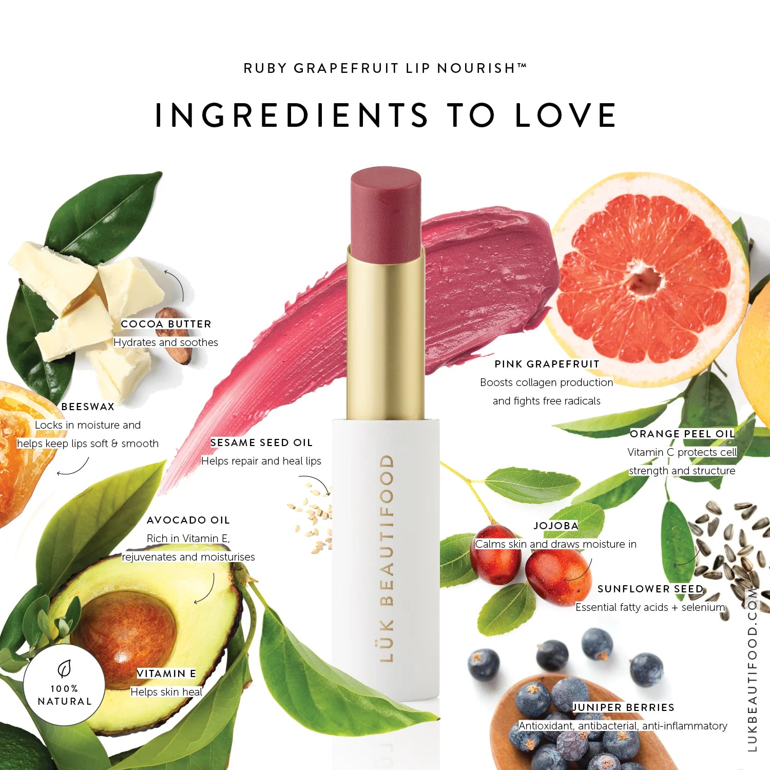 - One full sized Ruby Grapefruit Lip Nourish™ - Rich pink blush.