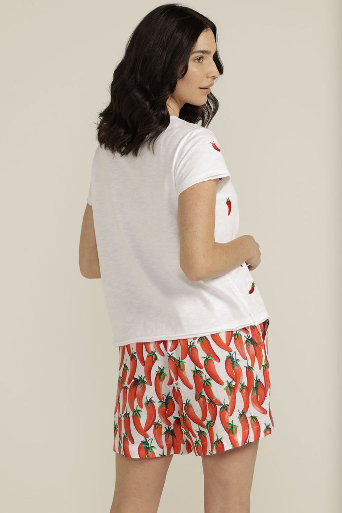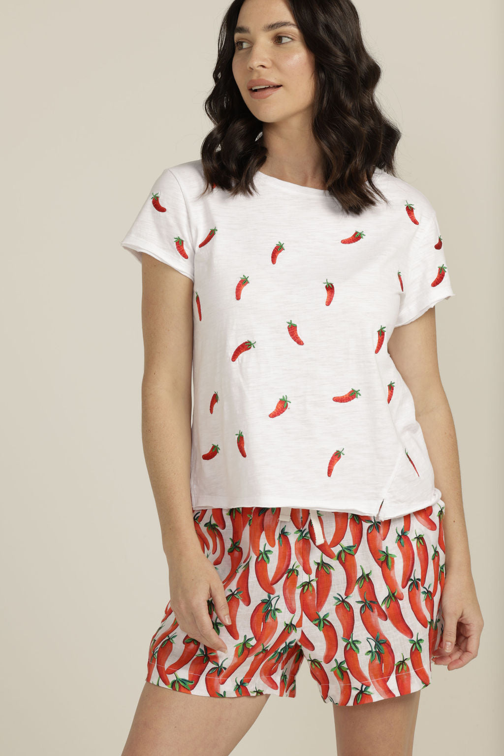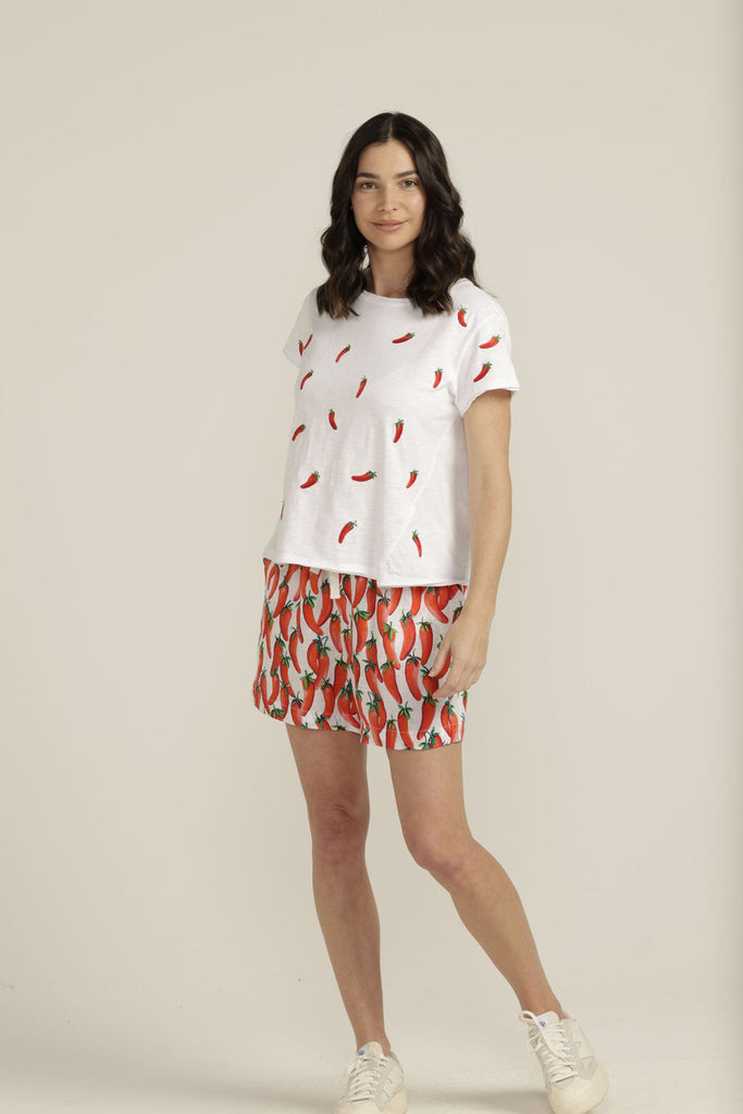 One of the feature prints of the season - the Chilli Print Tee is a boxy style tee with raw hems
