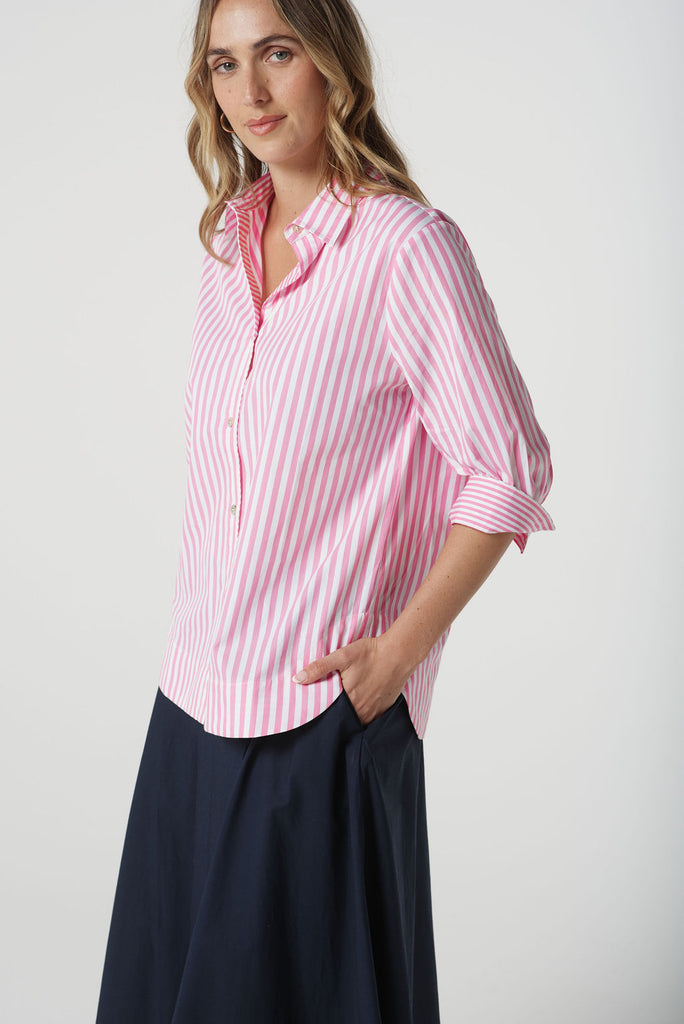 Classic Cotton 3/4 Sleeve Stripe Shirt - Pink Cosmos/White