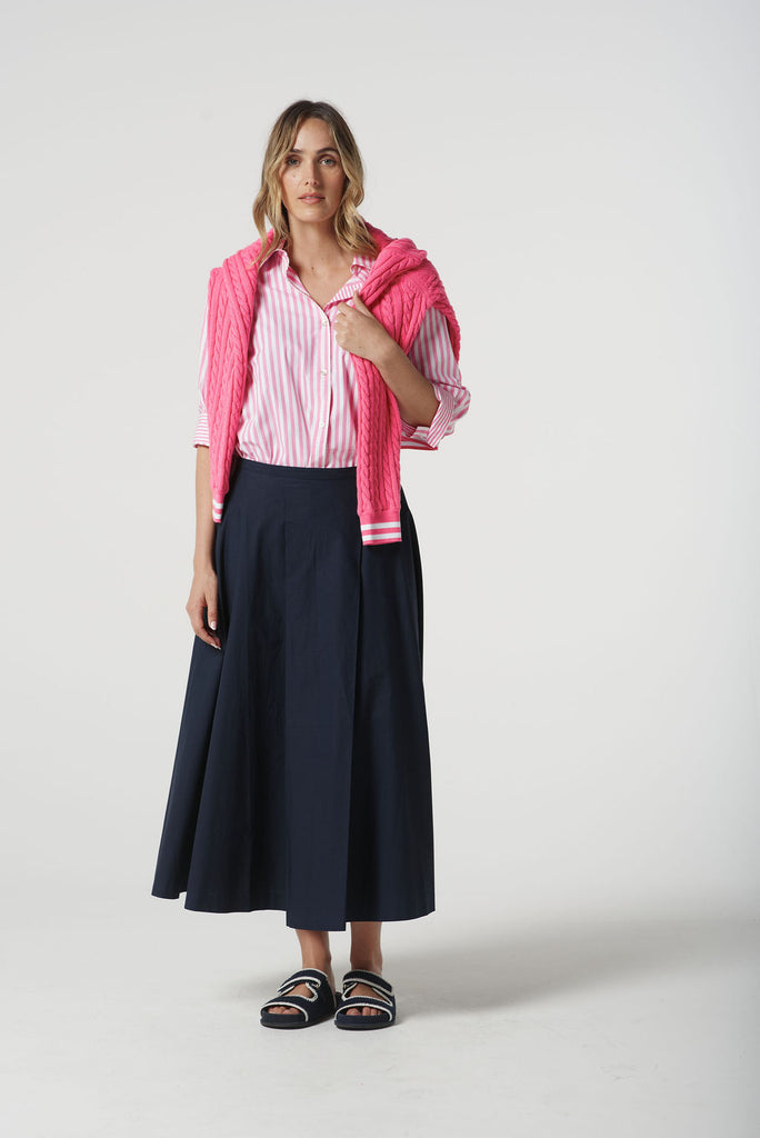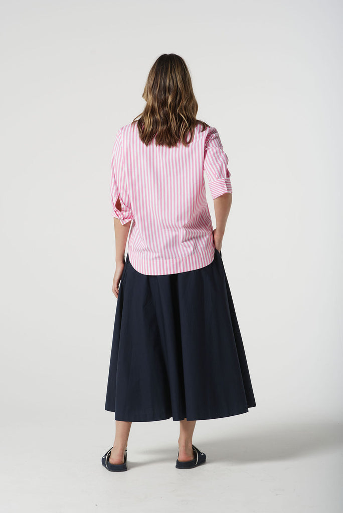 Made from yarn-dyed cotton poplin, this relaxed-fit stripe shirt keeps its crisp colours and structure wash after wash. The curved hem and three-quarter sleeves make it easy to tuck in or layer, adding a bright and timeless touch to any wardrobe.