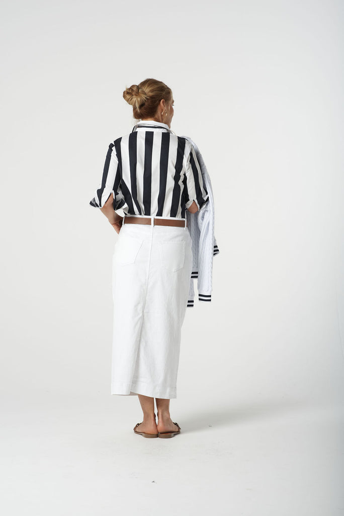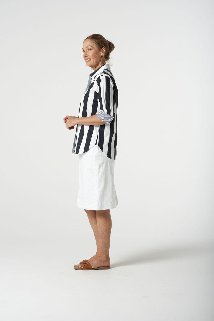 Fresh and versatile, the Contrast 3/4 Sleeve Shirt by Goondiwindi Cotton brings a modern twist to a timeless stripe. Made from 100% cotton poplin, this shirt features bold navy stripes, contrast cuffs, and a classic button-through front. The 3/4 sleeves make it perfect for layering or wearing on its own, taking you from weekday to weekend with ease.