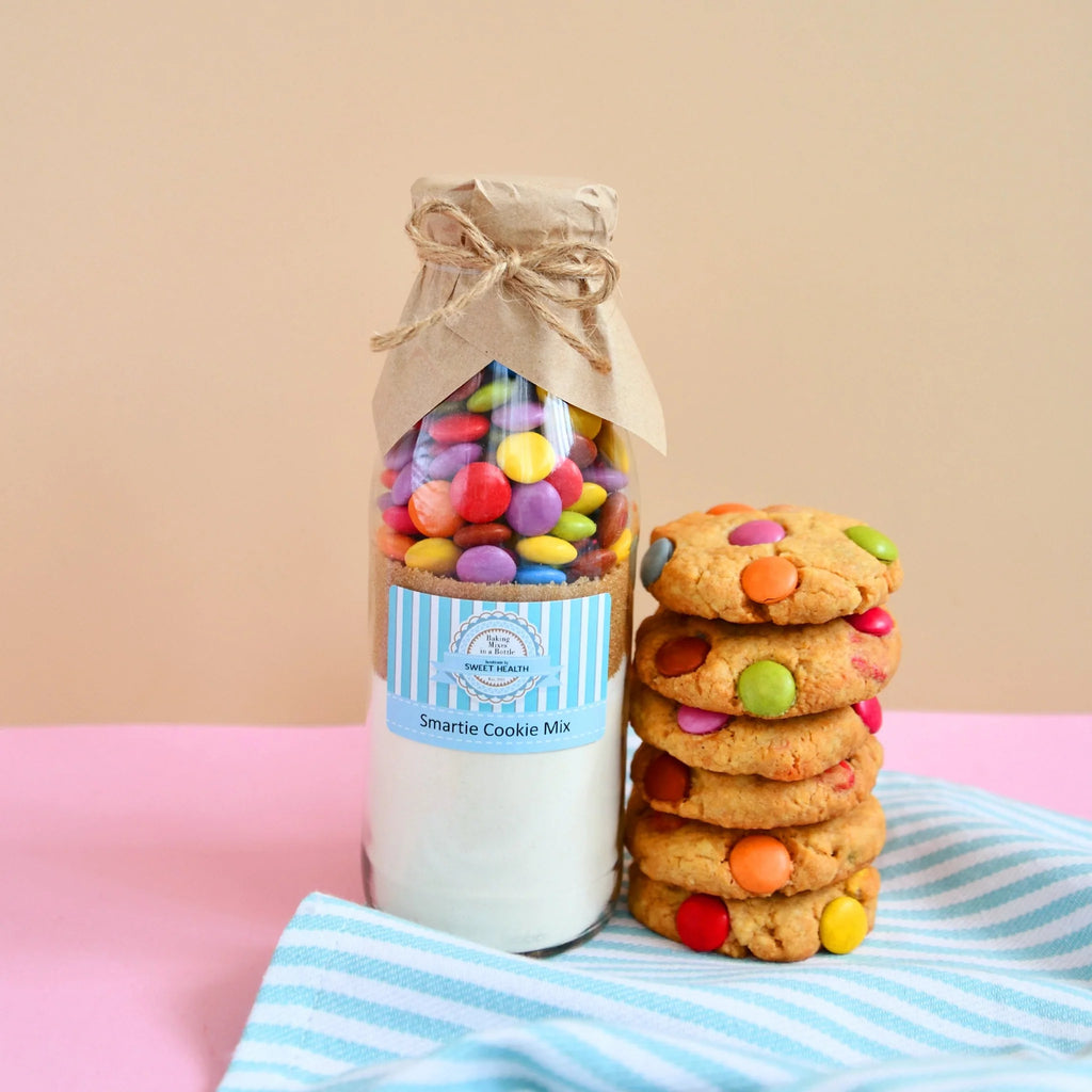 Each Mix contains our Signature Cookie Mix Base, topped with real Nestle Smarties and dressed in our Signature Branded label, Kraft paper topper, jute twine and instructional swing tag (containing all the information you need to know - ingredients, allergens, nutritional information and most importantly how to bake method).