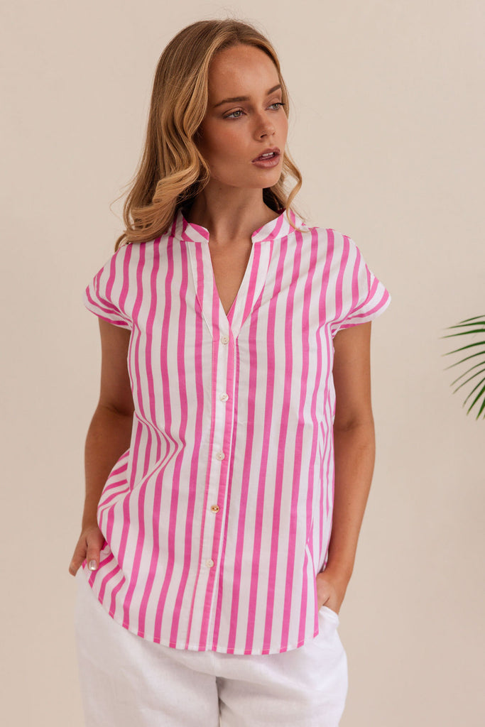 The Cotton Extended Sleeve Shirt from Kaleido is an easygoing essential in breathable 100% cotton. Featuring a relaxed fit, extended short sleeves, and a crisp button‑through front, it’s finished in fresh vertical stripes for a timeless look. Available in Blue/White and Pink/White, it pairs effortlessly with denim, linen, or tailored separates for laid‑back summer style.