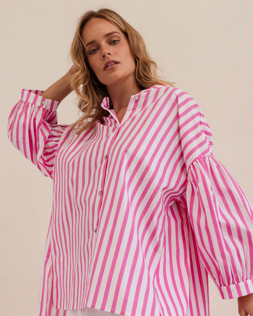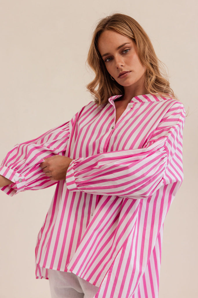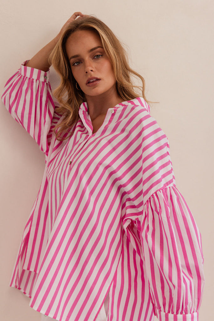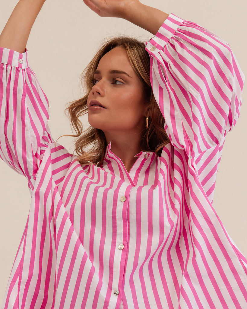 Cotton Gathered Sleeve Shirt – Pink/White Stripe