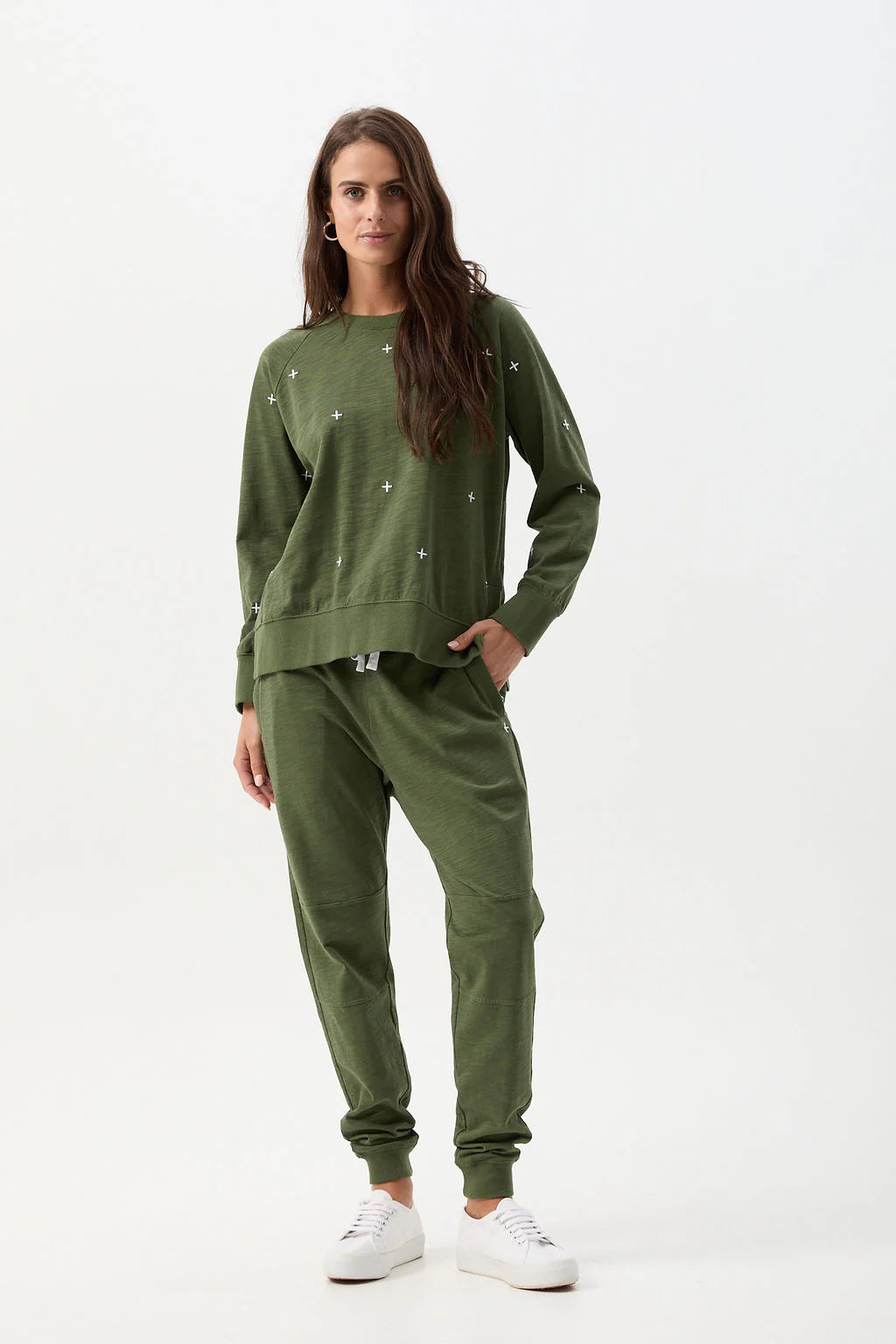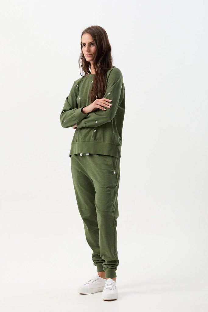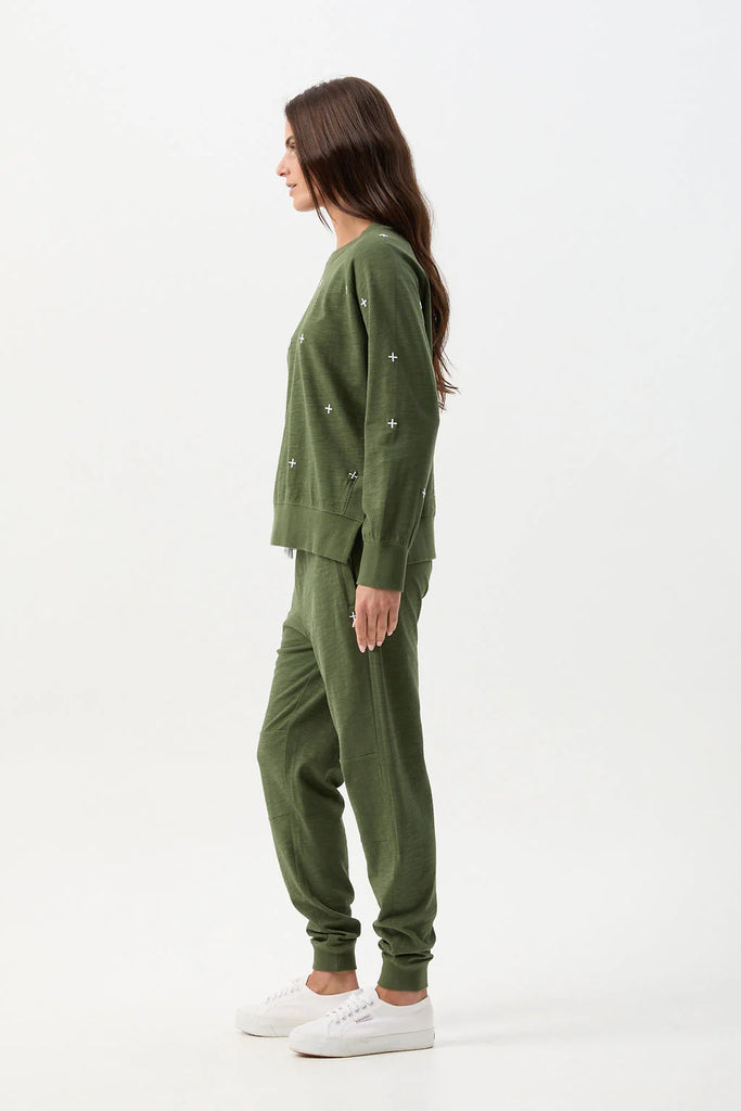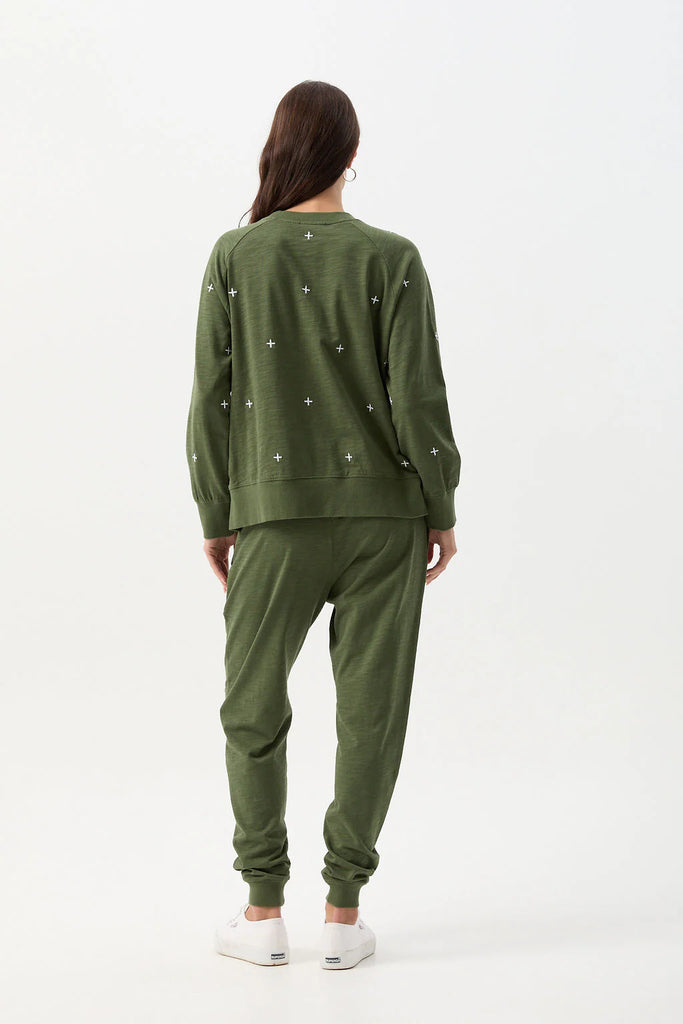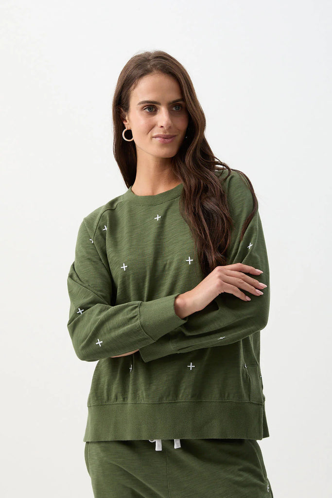 Cotton Slub Cross Embroidered Sweater - Bronze Green