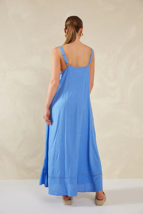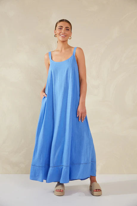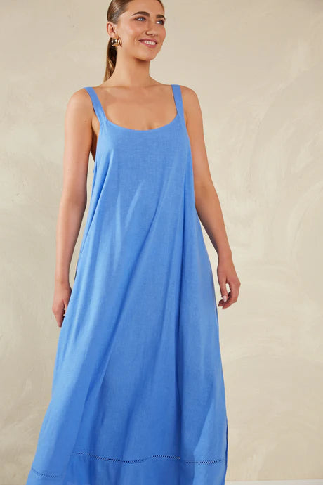From sunny strolls to dancing under the stars, the Florence Tank Maxi is your go-to! In an elegant A-line shape, this dress flatters every figure. Adjustable shoulder straps, a scoop neck, high side vents, and a breathable linen blend keep you feeling fresh. Pair it with slides for daytime adventures, then add a cape, wedges, and bold accessories for nighttime excitement!