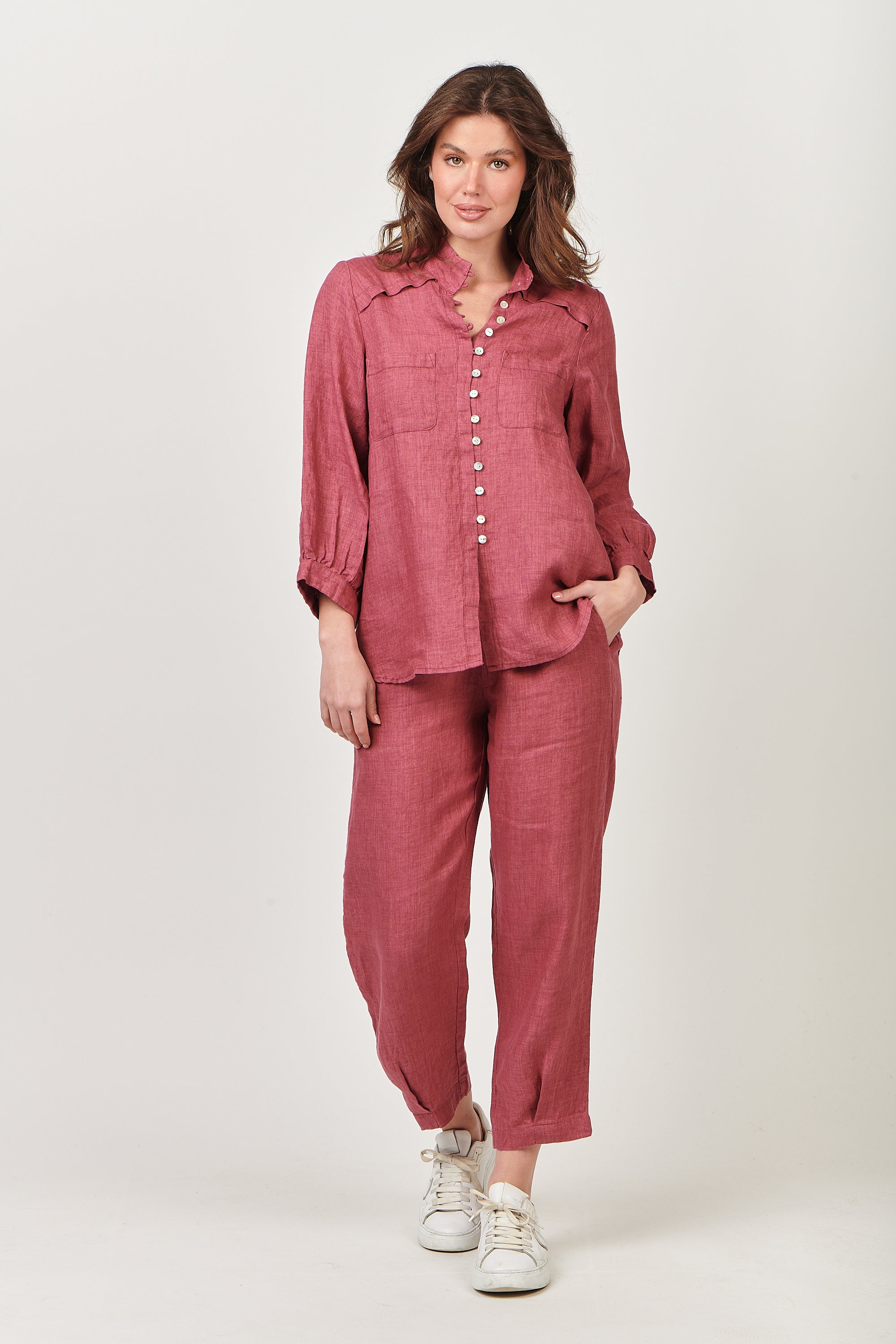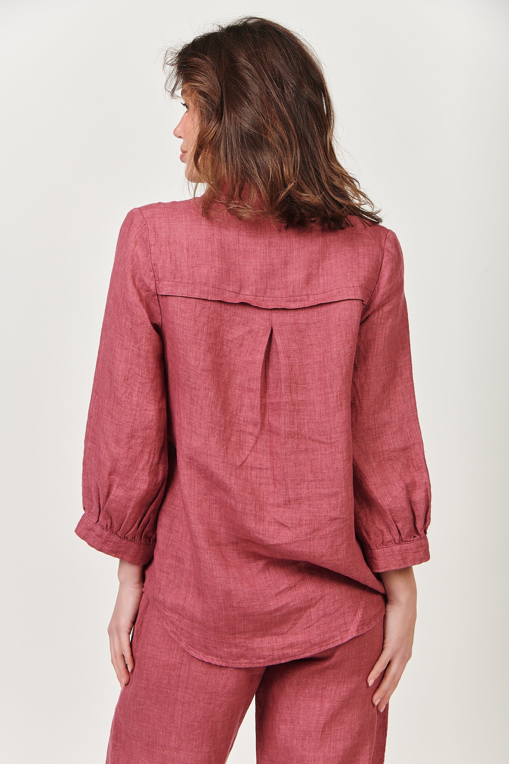 It’s all in the details with GA498, a long-sleeve, button-up linen shirt with a stand collar and bracelet sleeve. This shirt features two subtle breast pockets, pintuck detailing on the shoulders and at the back, and a slight balloon sleeve with a minimalist cuff. A relaxed design that can be worn tucked in or loose, collar opened or closed, with mother-of-pearl buttons that go most of the way down.