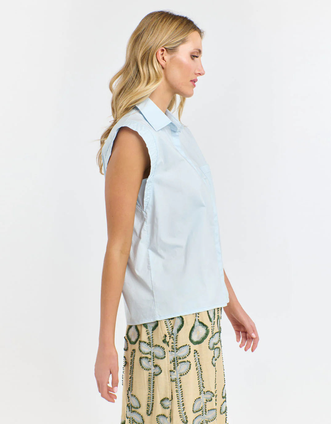 - Light blue sleeveless shirt