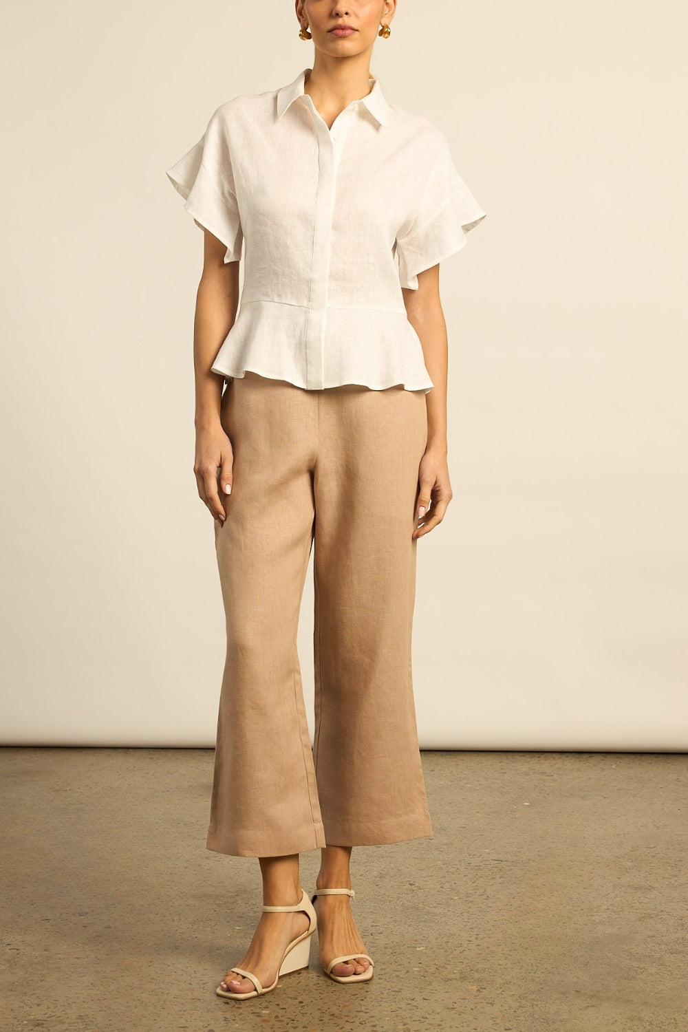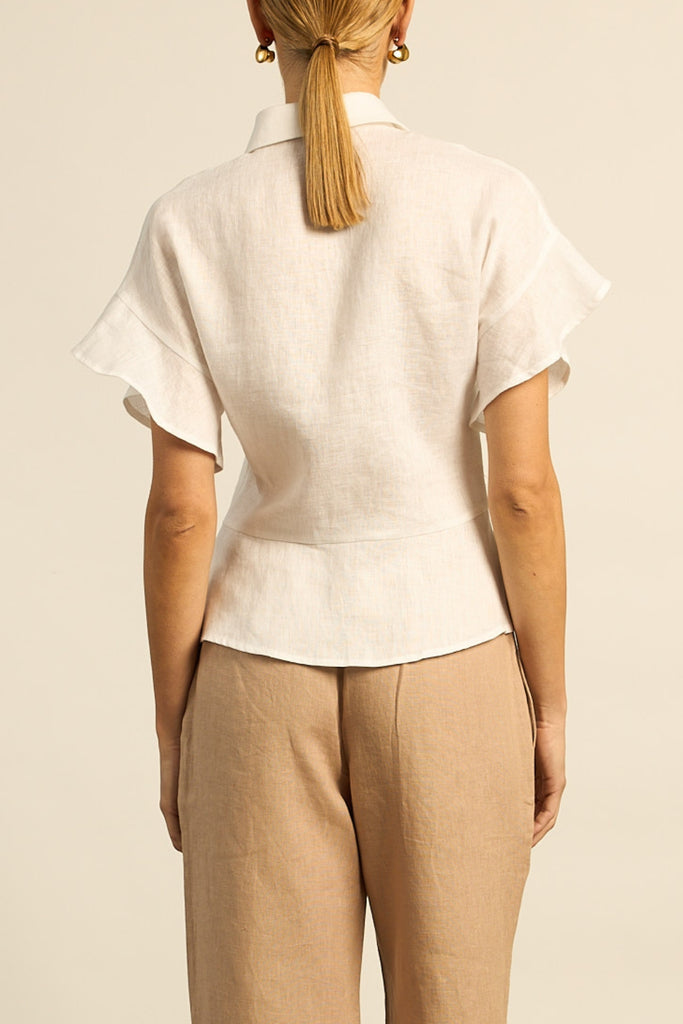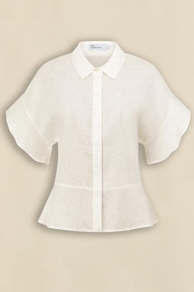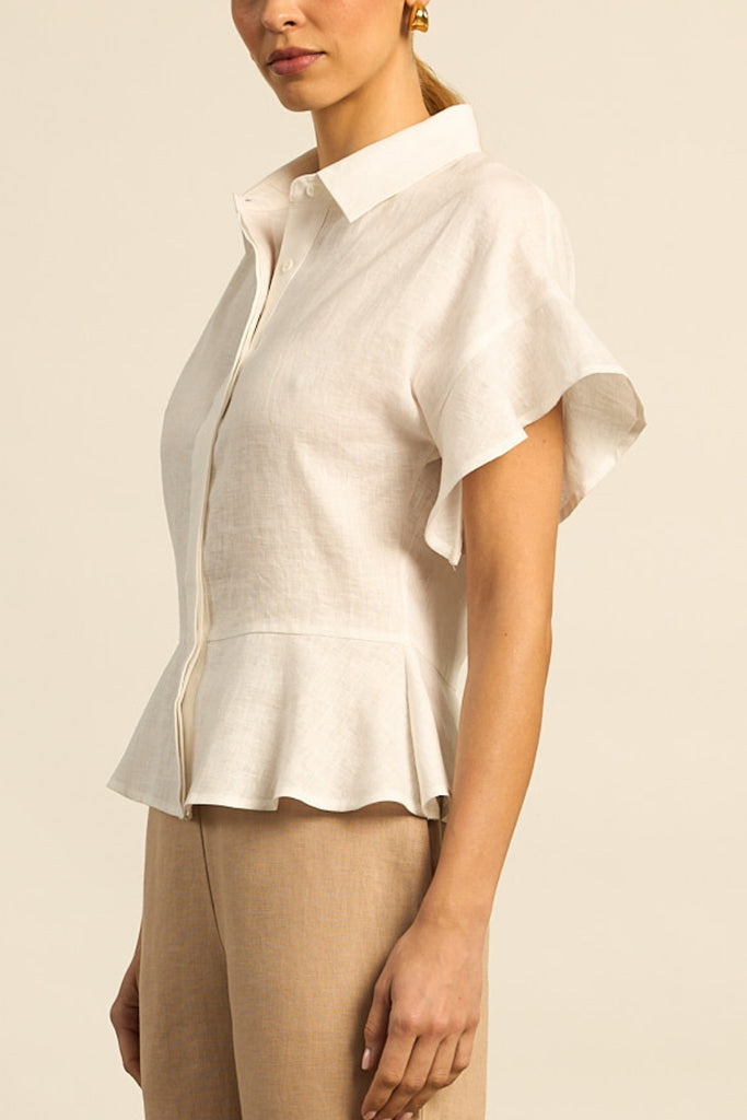 featuring dramatic flutter sleeves and a semi structured peplum shape. porcelain shell buttons are concealed beneath a covered placket, keeping the focus on proportion. contemporary yet highly wearable, it’s a versatile piece designed for elevated everyday dressing.
