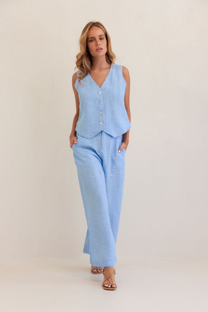 The Linen Button Front Vest from Kaleido is a fresh take on tailored summer dressing. Crafted from breathable 100% linen in a soft chambray blue, it features a flattering V‑neckline, a neat button‑through front, and a streamlined fit. Perfect worn on its own for a minimalist look or layered over shirts and tees, it pairs effortlessly with the matching Linen High Waisted Wide Leg Pant for a coordinated set.
