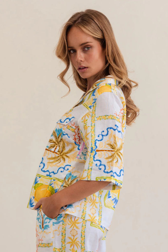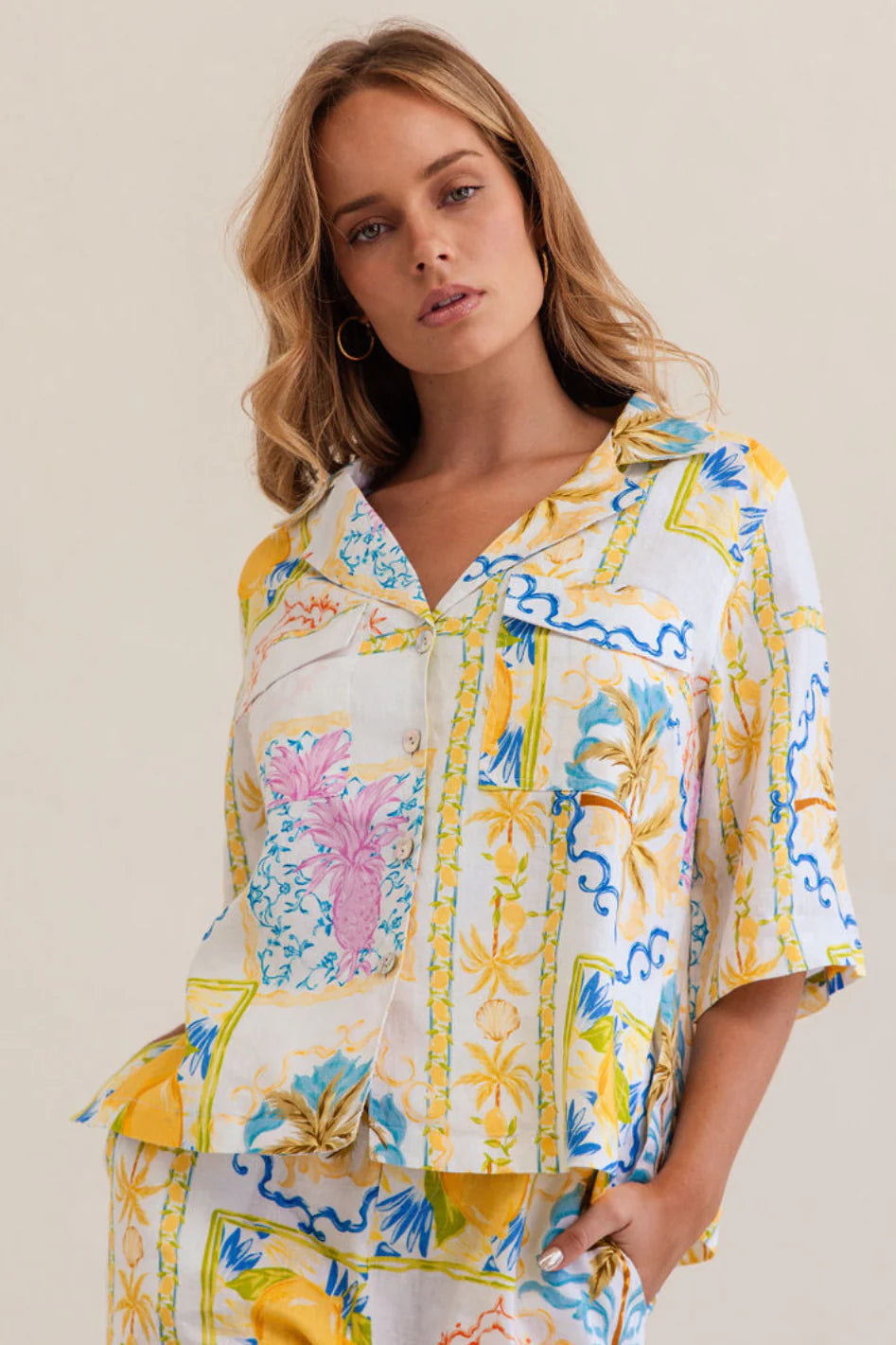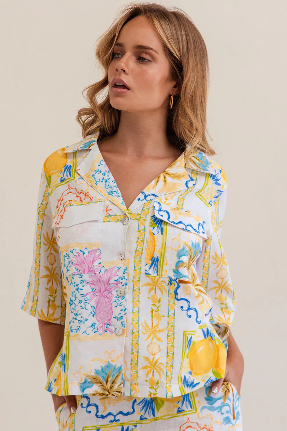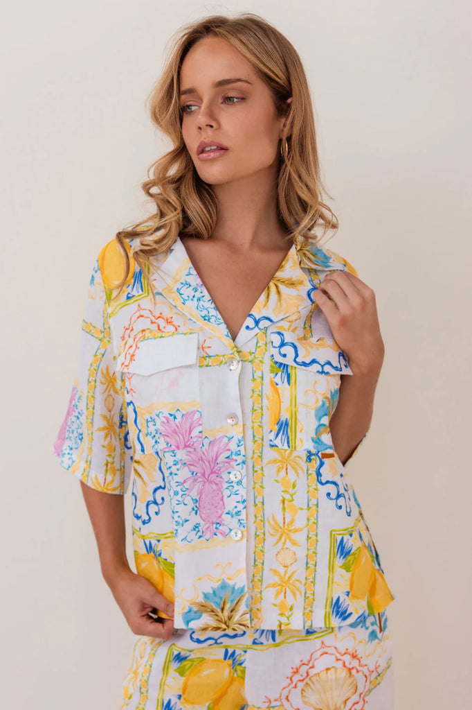 Designed for effortless style and comfort, the Linen Safari Shirt by Australian label Kaleido showcases a striking tropical vacation-inspired print in vibrant summer colours. With a classic button-down front, collar, and two front patch pockets, this gorgeous safari-style shirt blends structure with a relaxed linen feel. Wear it tucked into tailored linen pants for a refined look, or pair it with the matching Linen Elastic Waist Pocket Midi Short – Amalfi Dreams for a stylish, coordinated outfit.