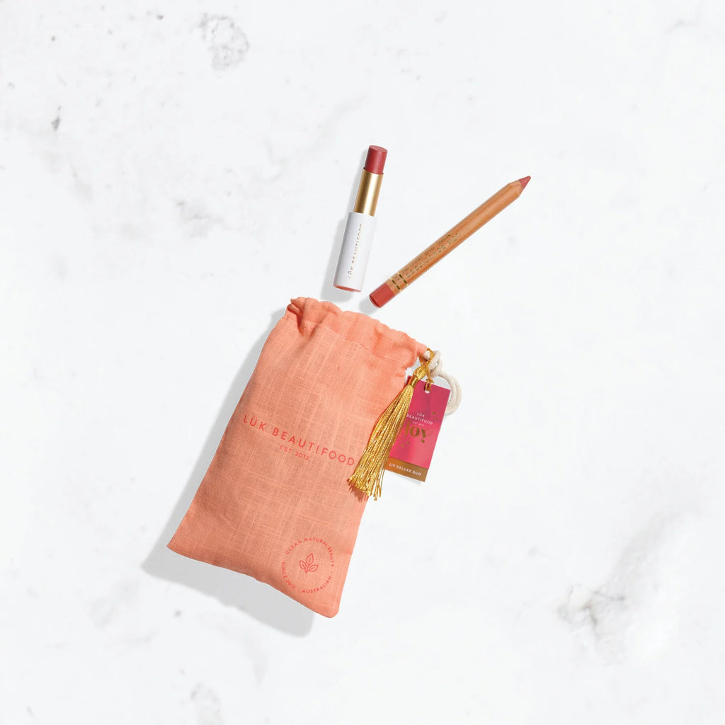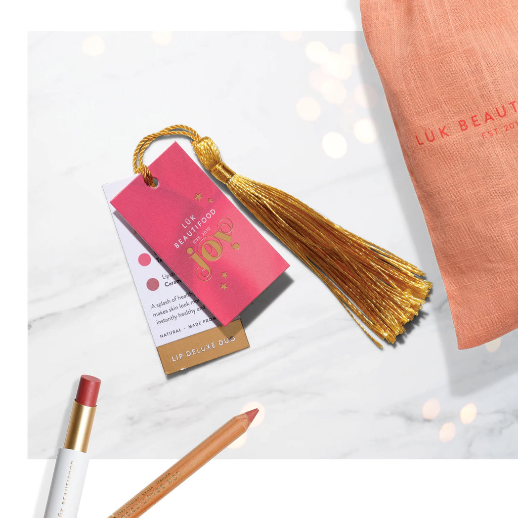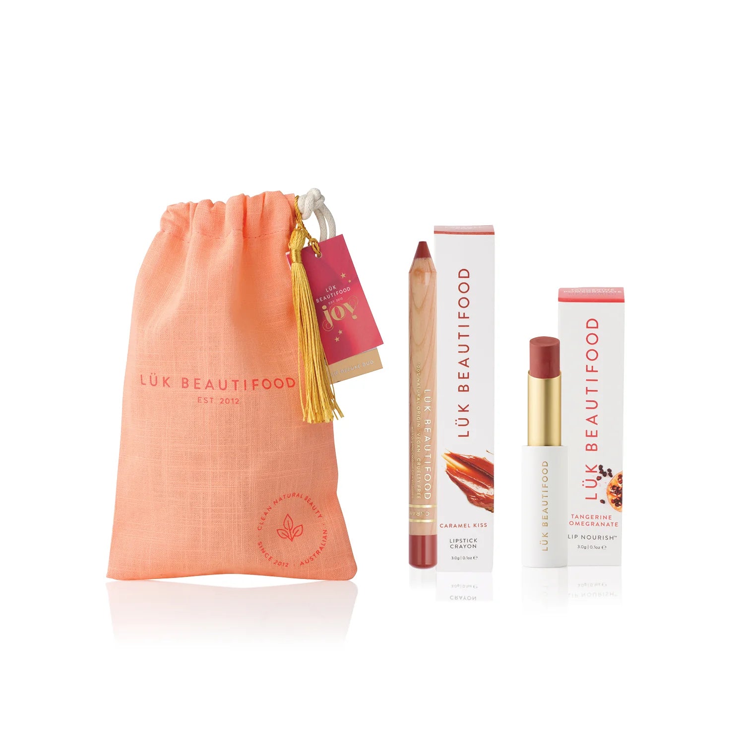 Tangerine Pomegranate Lip Nourish™ in this gift features Lük Beautifood’s proprietary AAA Hydra-Soft Complex™, a potent botanical blend of oils, butters and waxes to comfort and replenish lips.