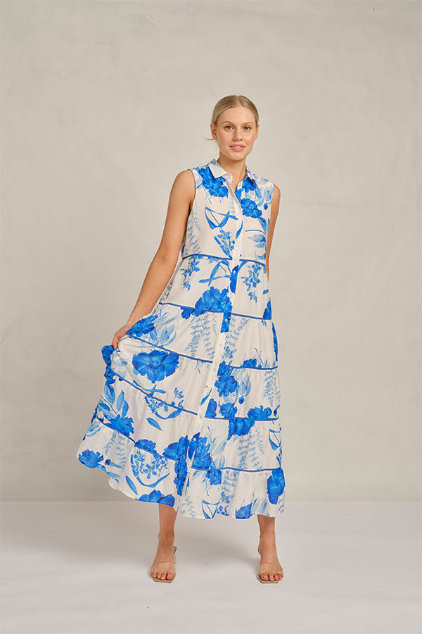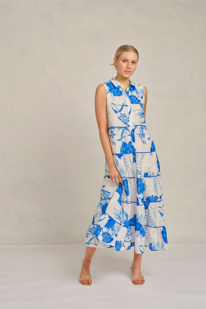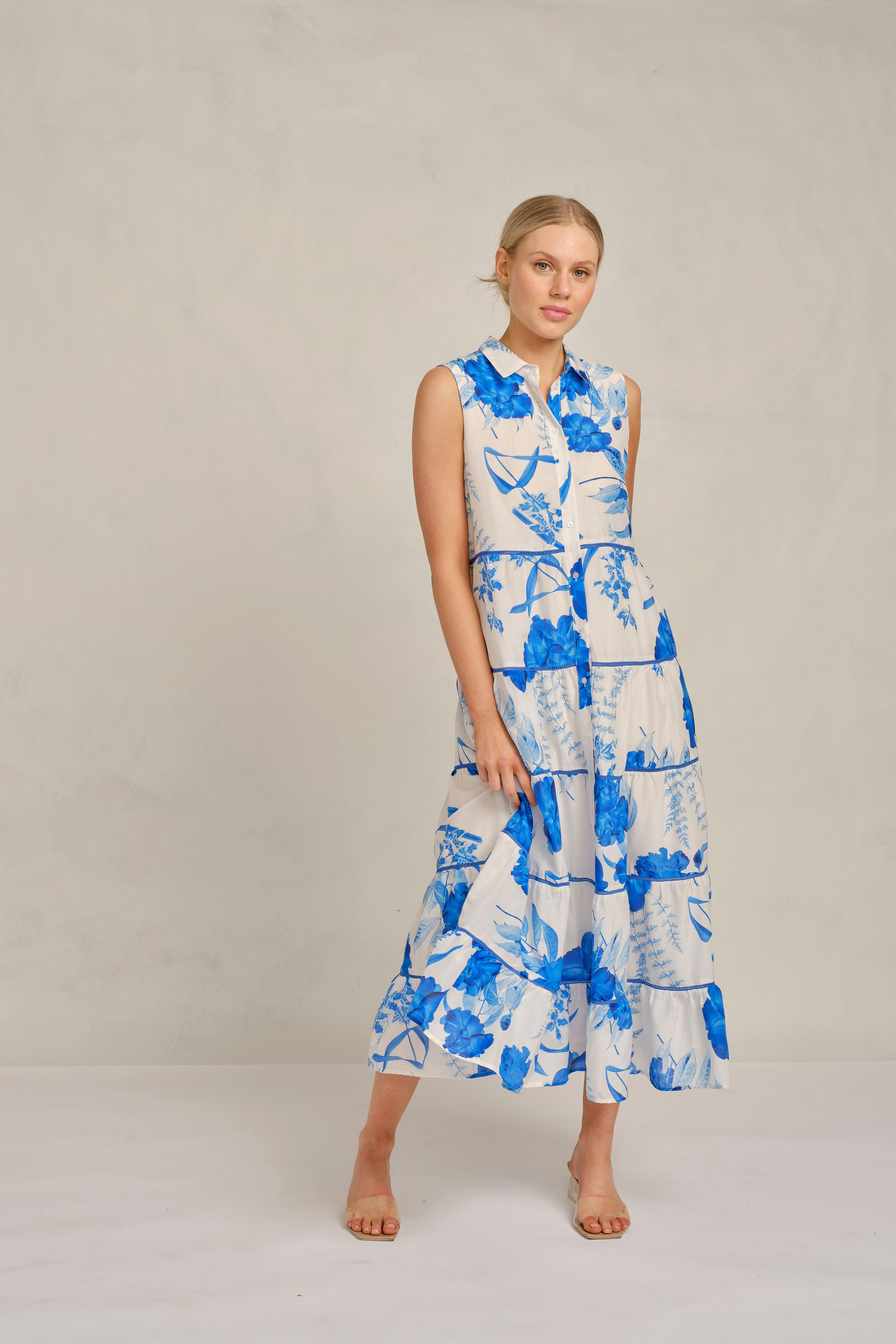 Marlow Cotton Silk Dress in Blue Quartz Night Garden Print